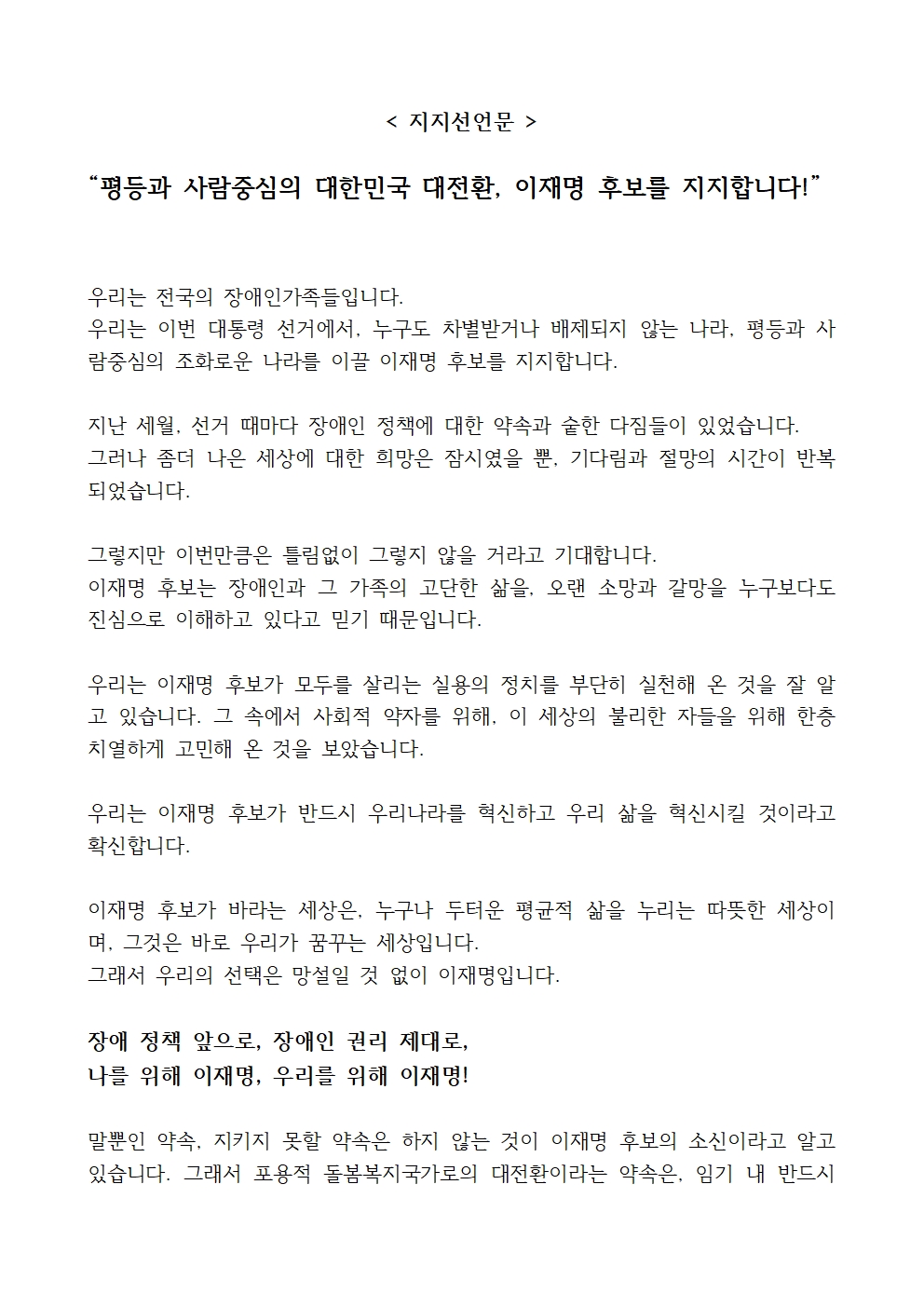 [보도자료] 더불어민주당 선대위 포용복지국가위원회, 장애인가족 22만 명 이재명 후보 지지선언 기자회견