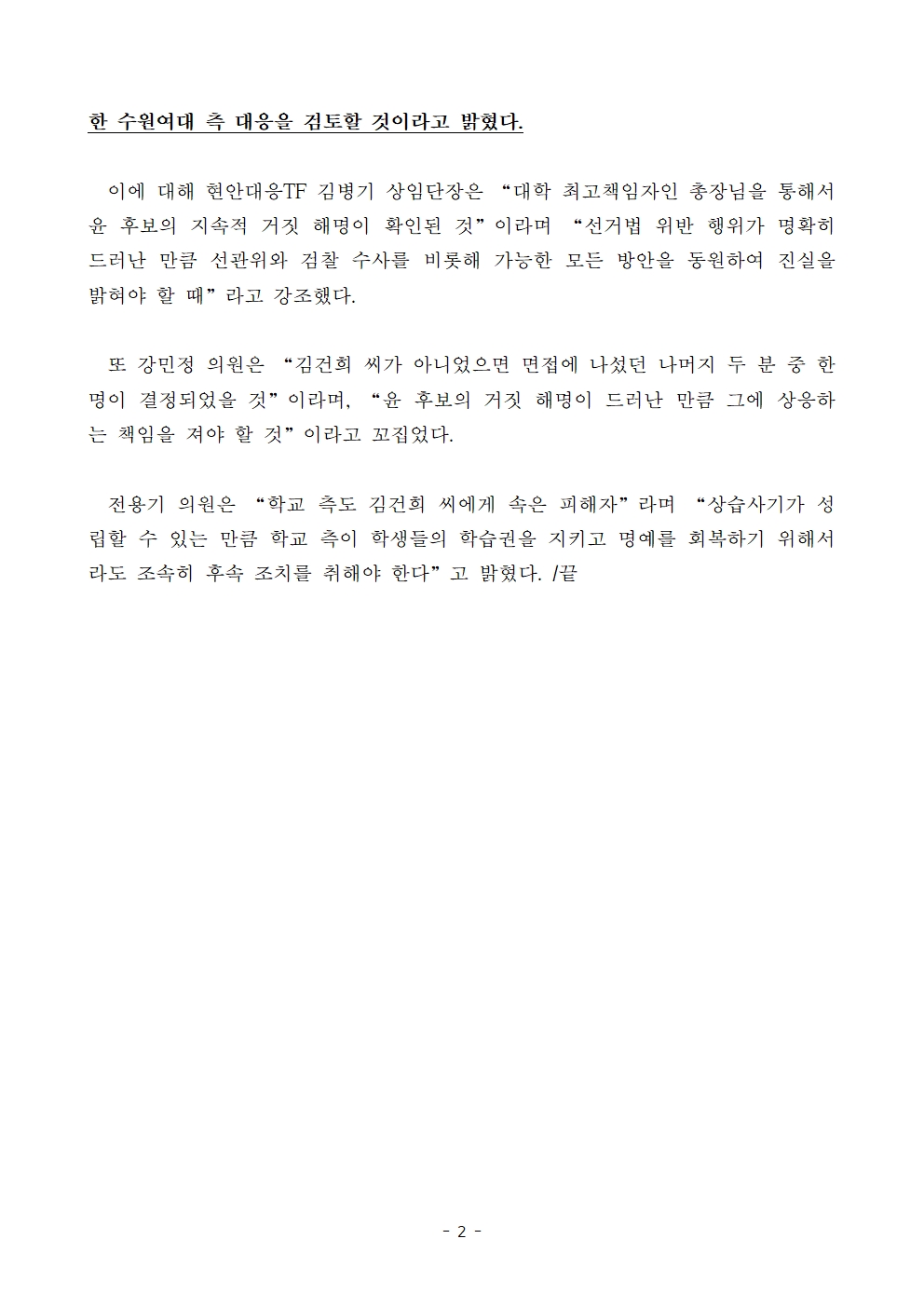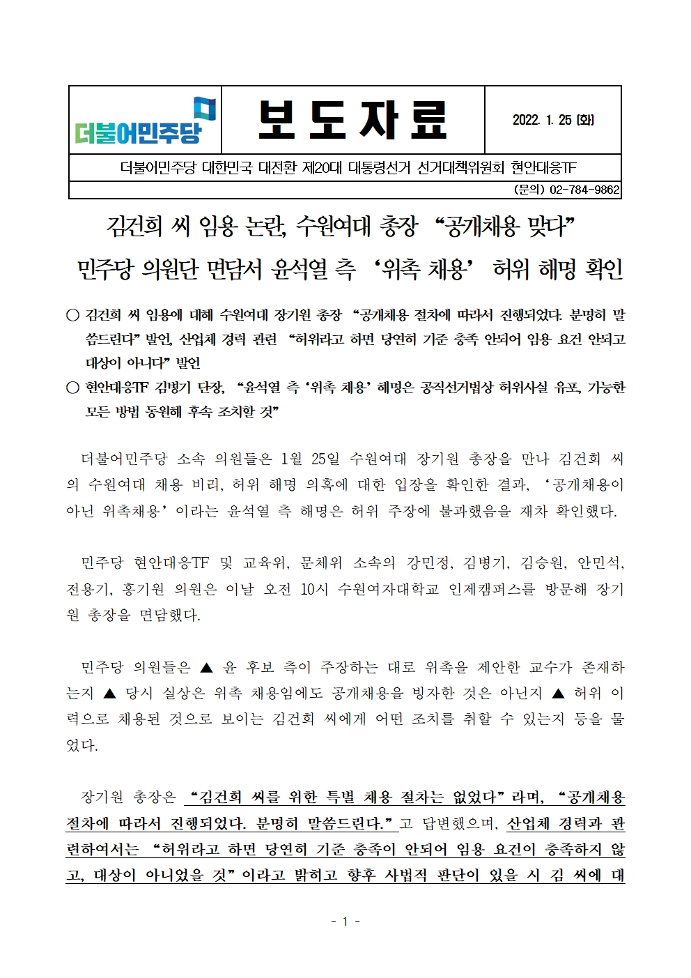 [보도자료] 더불어민주당 선대위 현안대응TF, 민주당 의원단, 수원여대 총장 면담서 윤석열 측 '위촉 채용' 허위 해명 확인