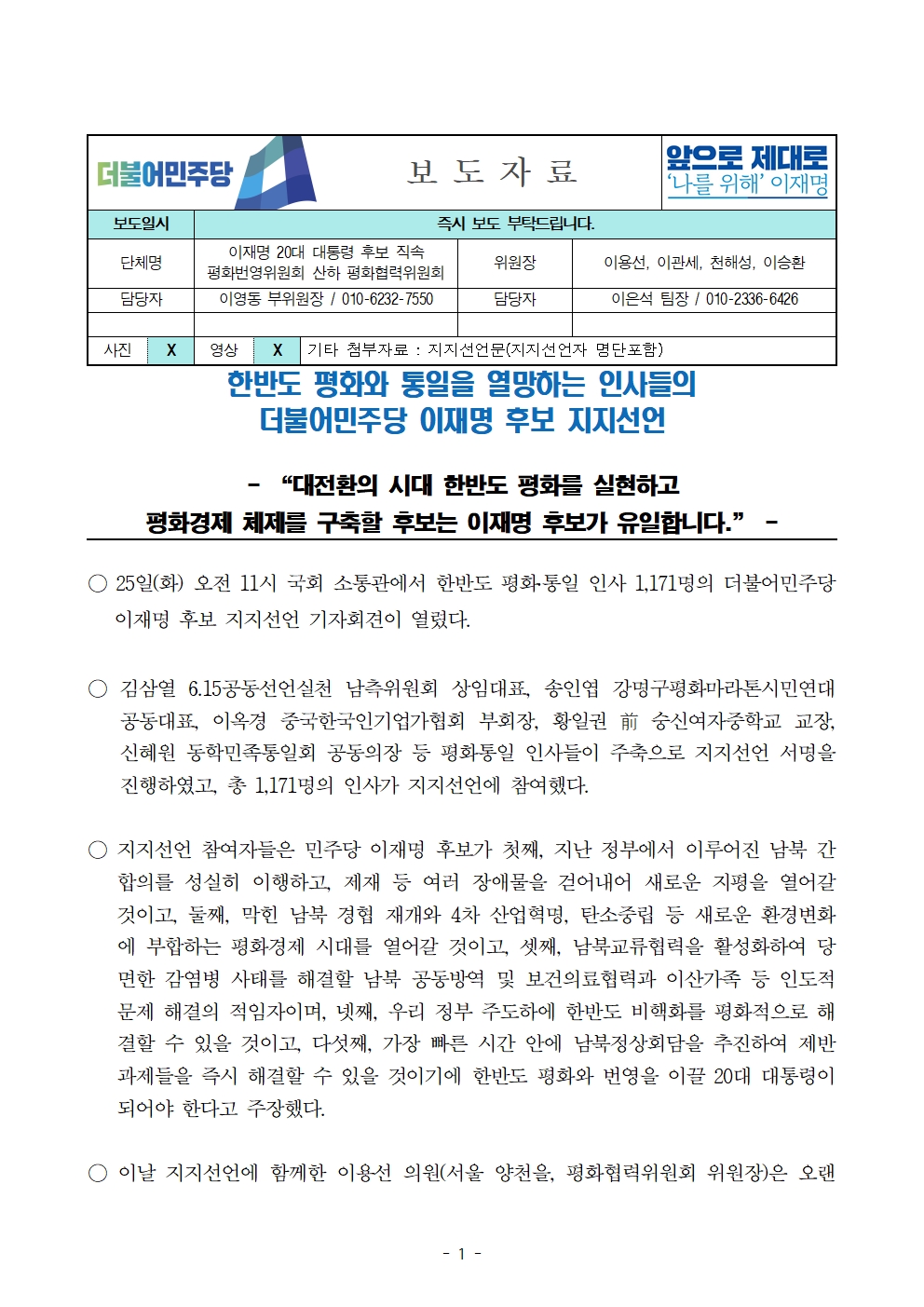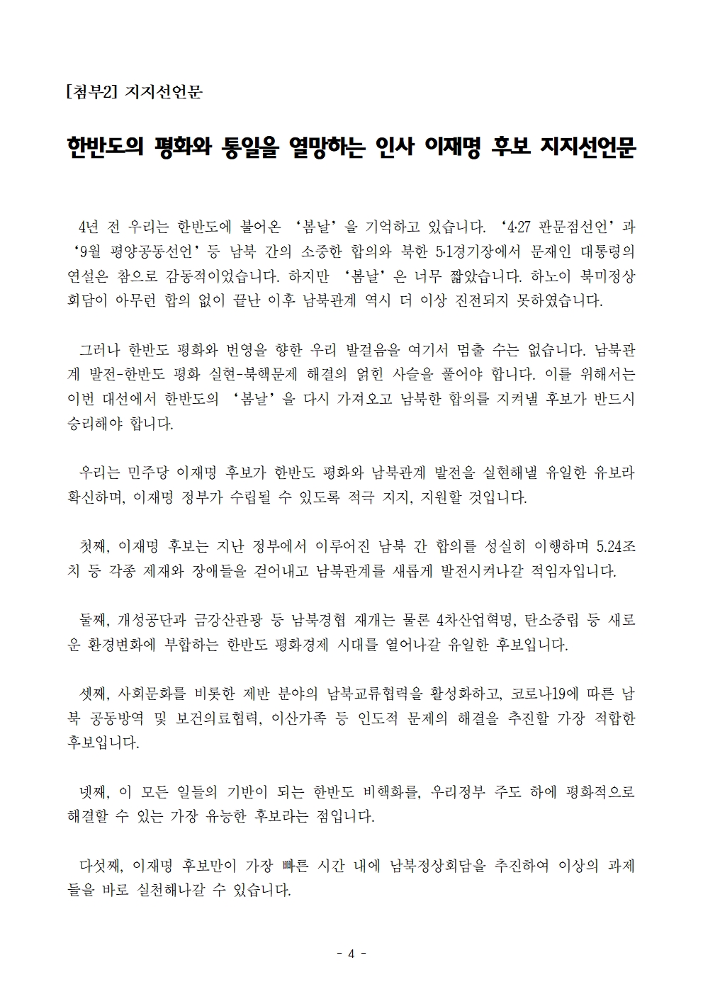 [보도자료] 더불어민주당 선대위 평화협력위원회, 한반도 평화통일 인사 지지선언 기자회견
