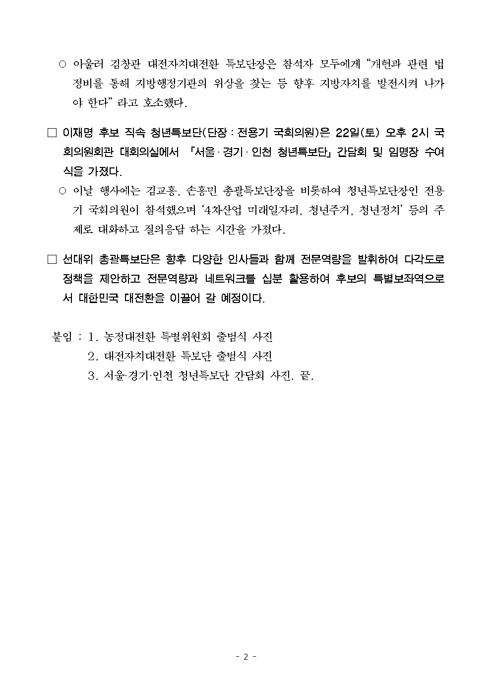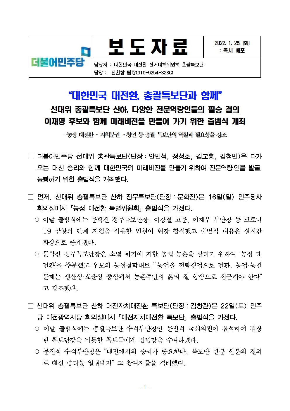 [보도자료] 더불어민주당 선대위 총괄특보단, 정무특보단·대전자치대전환 특보단 출범식 및 청년특보단 간담회 개최