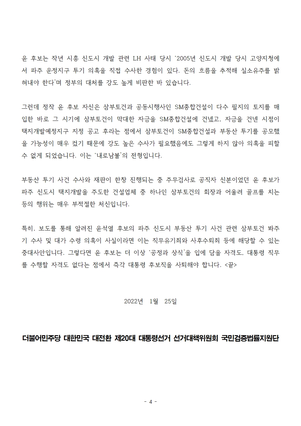 [보도자료] 더불어민주당 선대위 국민검증법률지원단, 윤석열 후보 삼부토건 봐주기 수사 의혹 관련 기자회견