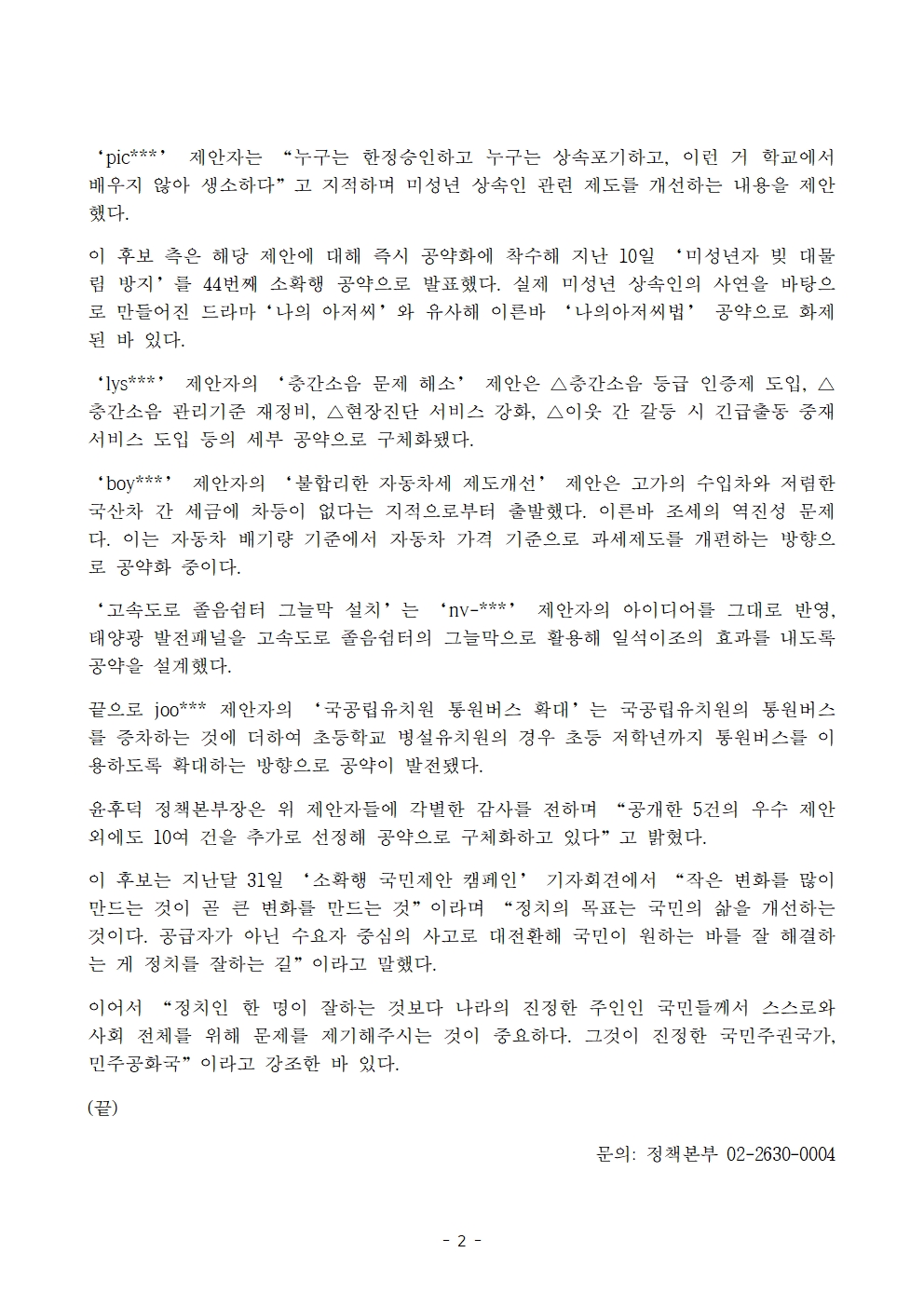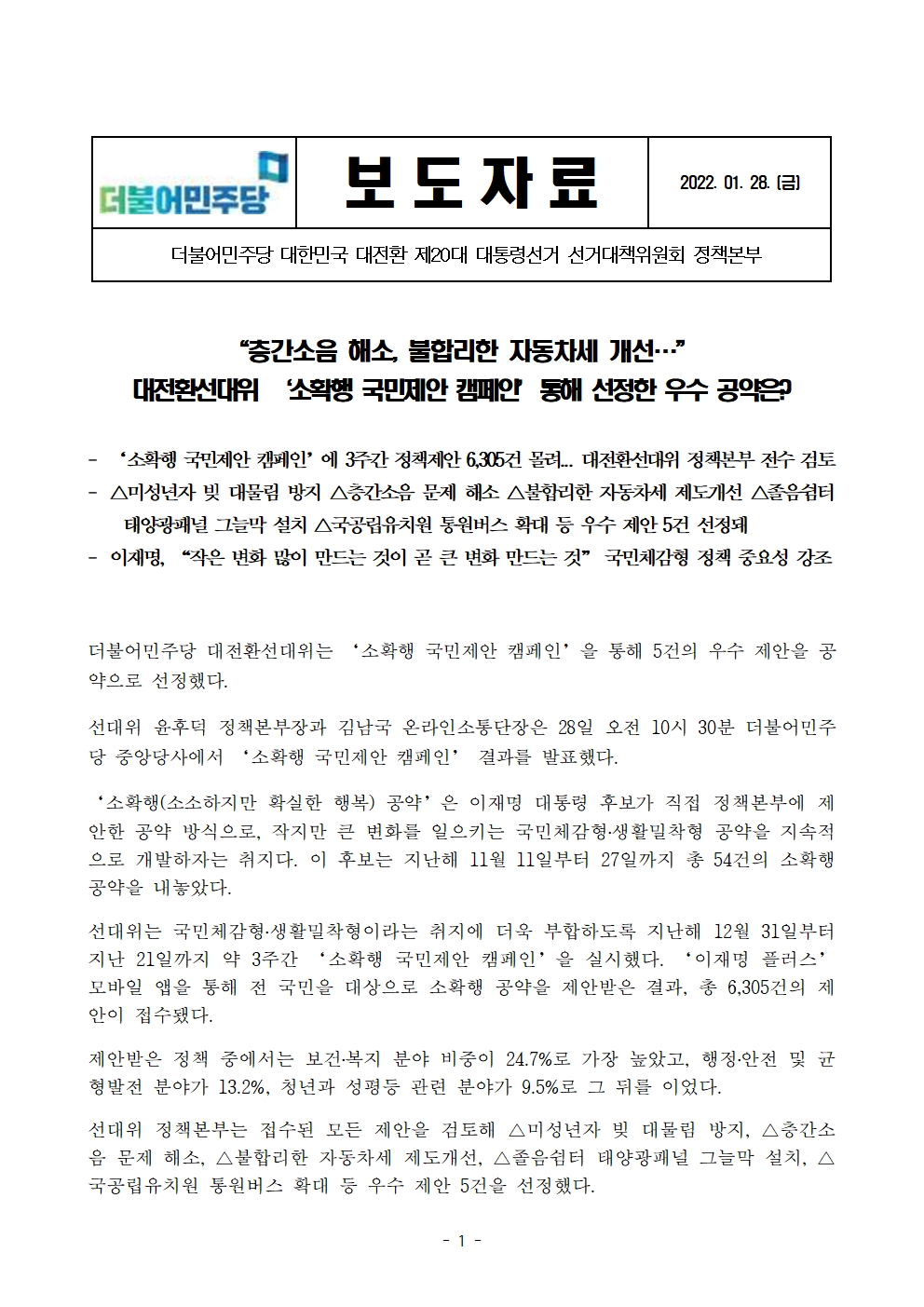 [보도자료] 더불어민주당 선대위 정책본부, '소확행 국민제안 캠페인' 우수 제안 공약으로 선정