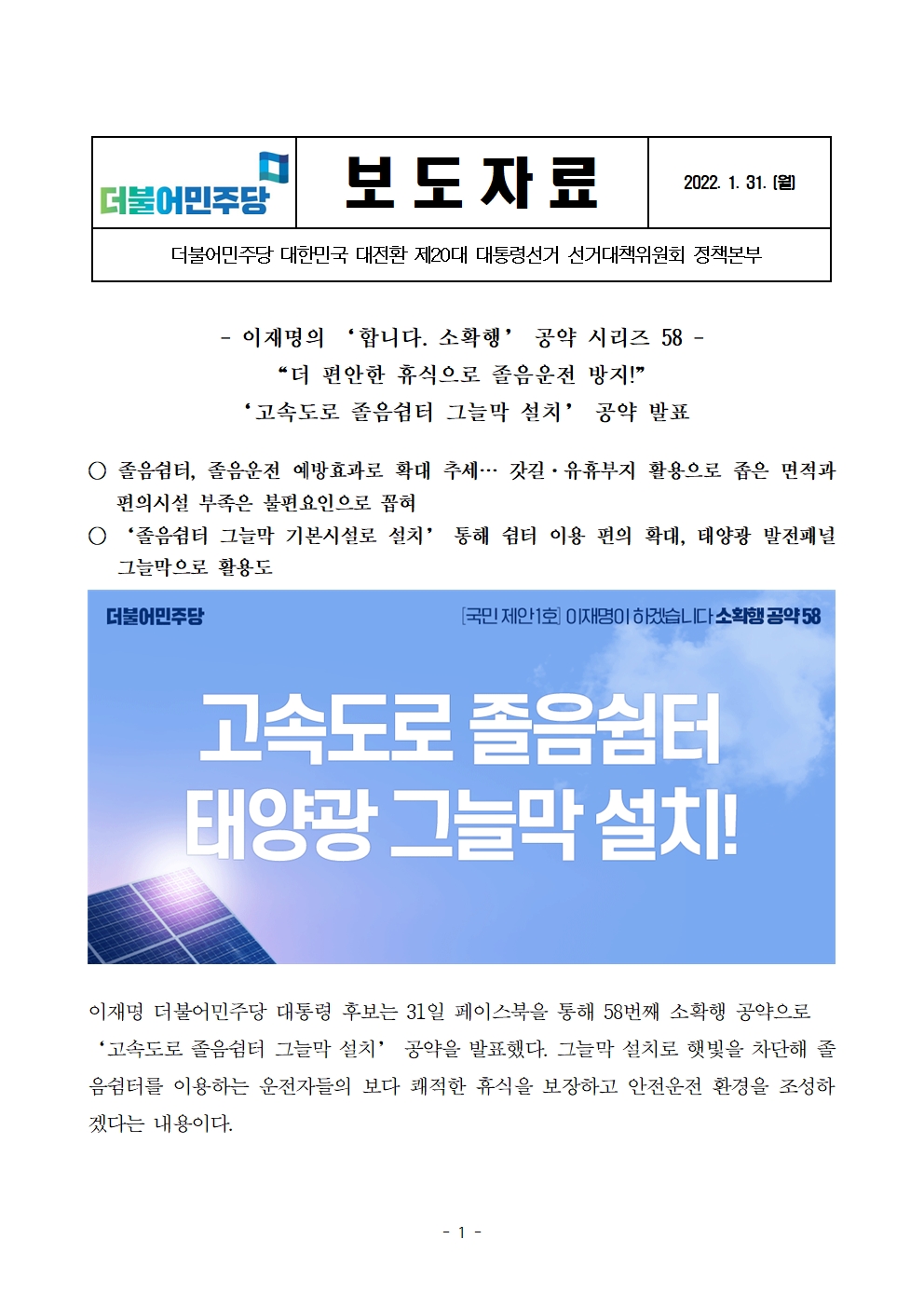 [보도자료] 더불어민주당 선대위 정책본부, '이재명은 합니다. 소확행 공약 시리즈 58' 고속도로 졸음쉼터 그늘막 설치 공약 발표