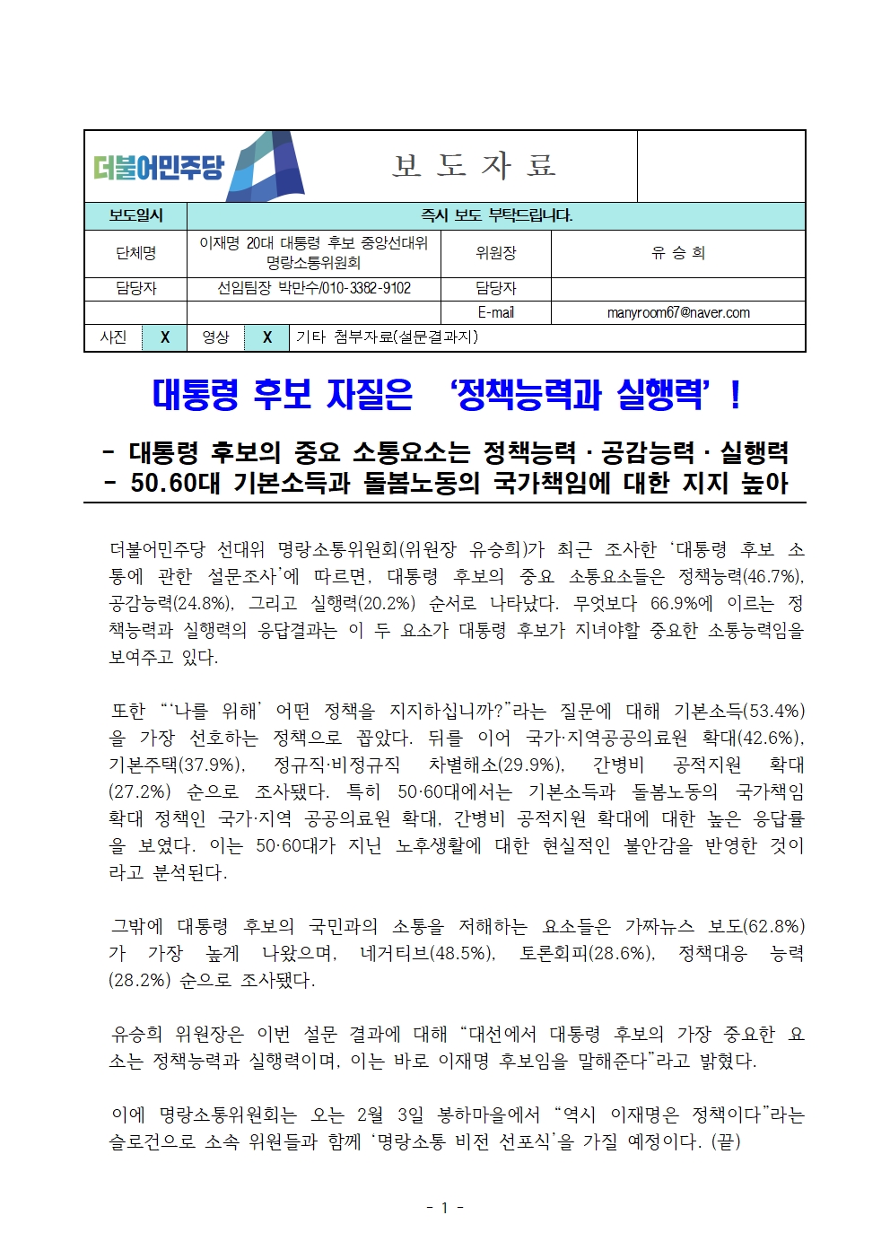 [보도자료] 더불어민주당 선대위 명랑소통위원회, 대통령 후보 소통에 관한 설문조사 결과 발표