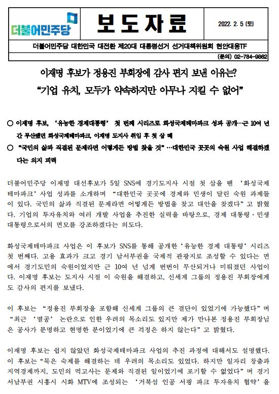 [보도자료] 더불어민주당 선대위 현안대응TF, 이재명 후보 '유능한 경제대통령' 첫 번째 시리즈 화성국제테마파크 성과 공개