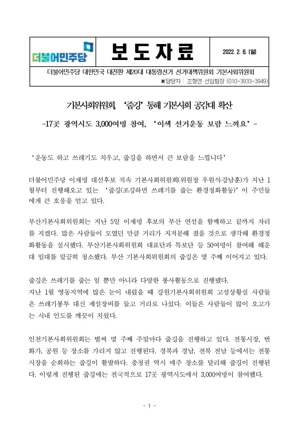[보도자료] 더불어민주당 선대위 기본사회위원회, ‘줍깅’통해 기본사회 공감대 확산