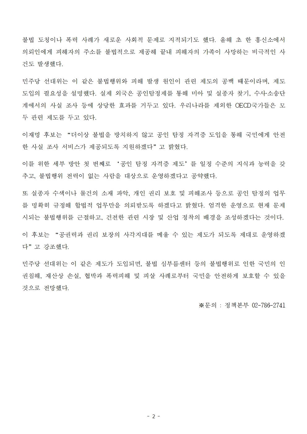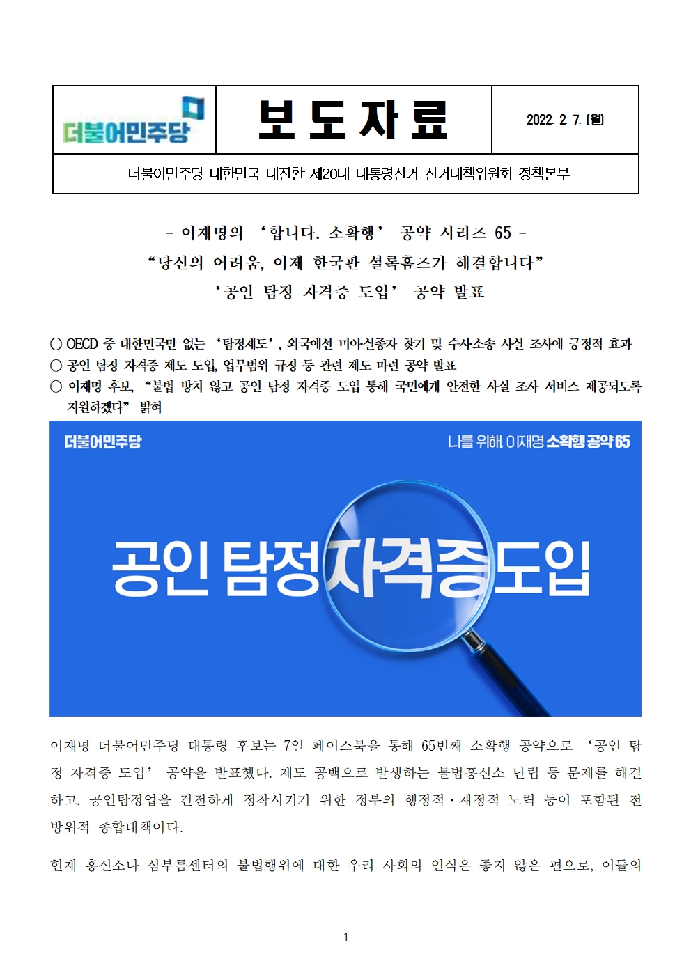 [보도자료] 더불어민주당 선대위 정책본부, '이재명은 합니다. 소확행 공약 시리즈 65' 공인 탐정 자격증 도입 공약 발표