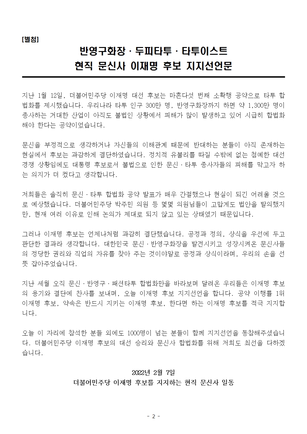 [보도자료] 더불어민주당 선대위 직능본부, 현직 문신사들 후보 공개 지지 선언