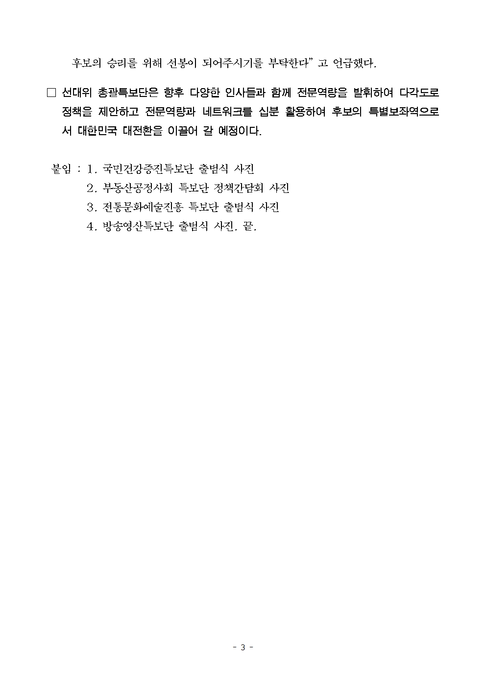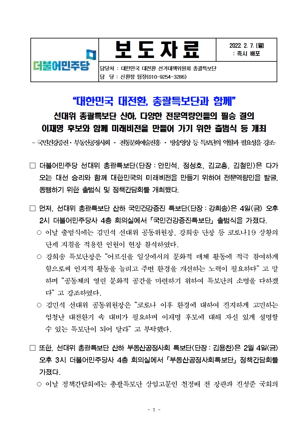 [보도자료] 더불어민주당 선대위 총괄특보단, 전문역량별 특보단 출범식 개최 및 필승 결의