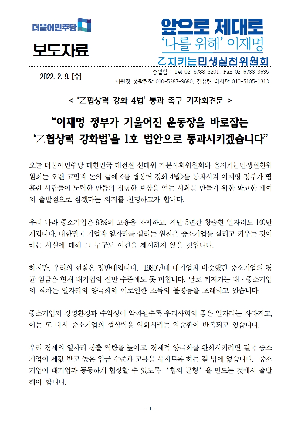 [보도자료] 더불어민주당 선대위 을지키는 민생실천위원회, '을 협상력 강화 4법' 통과 촉구 기자회견