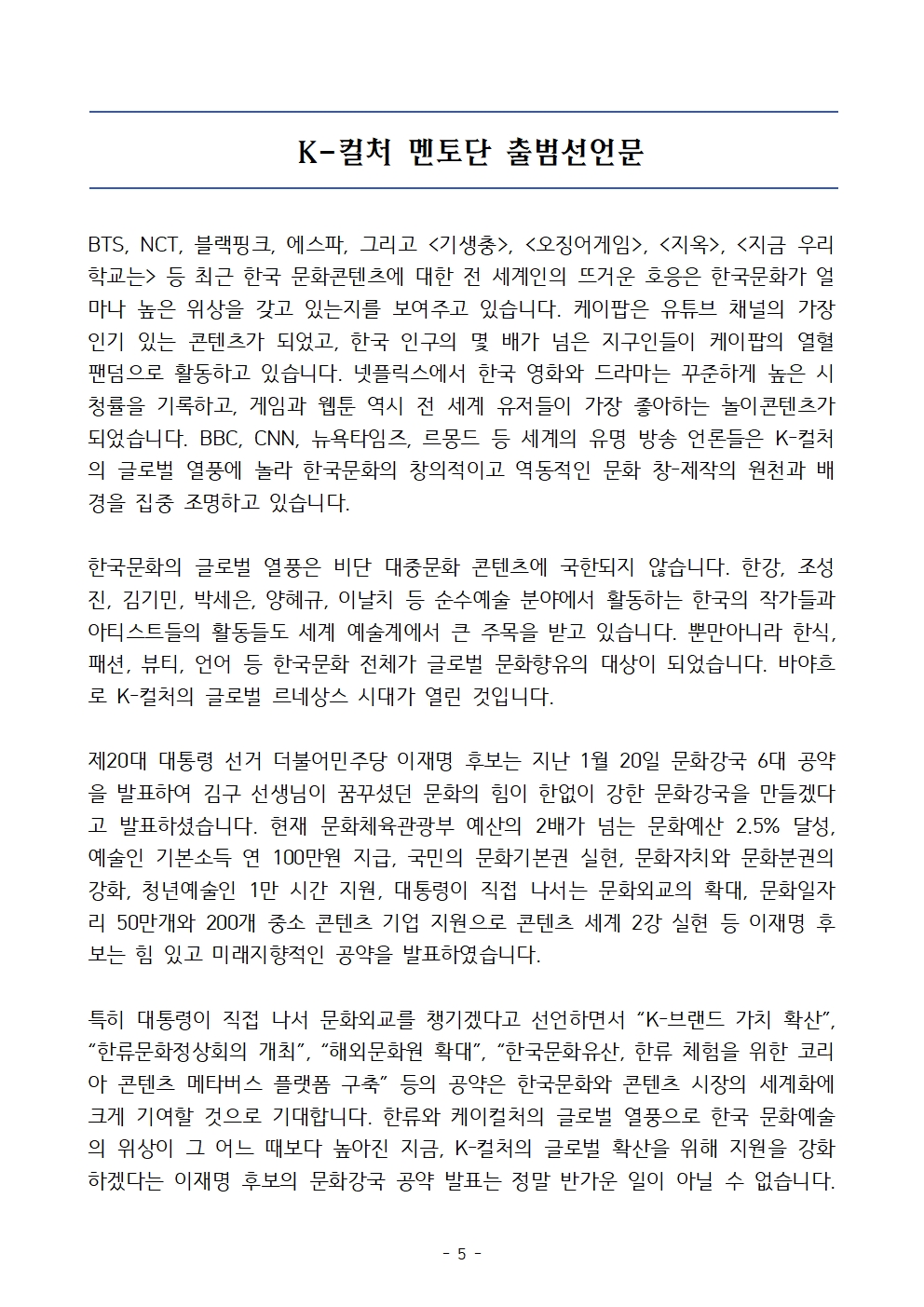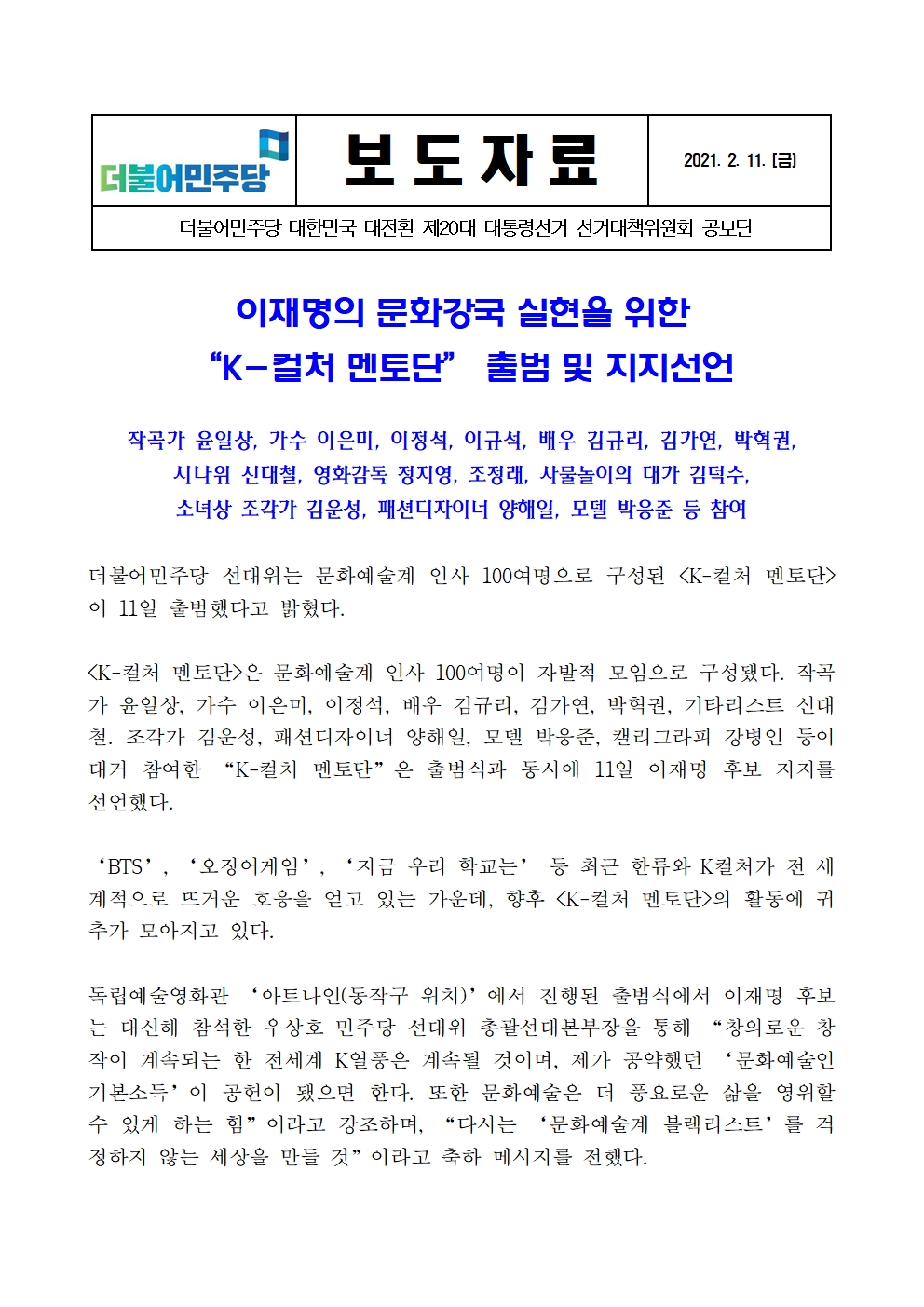 [보도자료] 더불어민주당 선대위 공보단, 문화강국 실현을 위한 'K-컬처 멘토단' 출범 및 지지선언