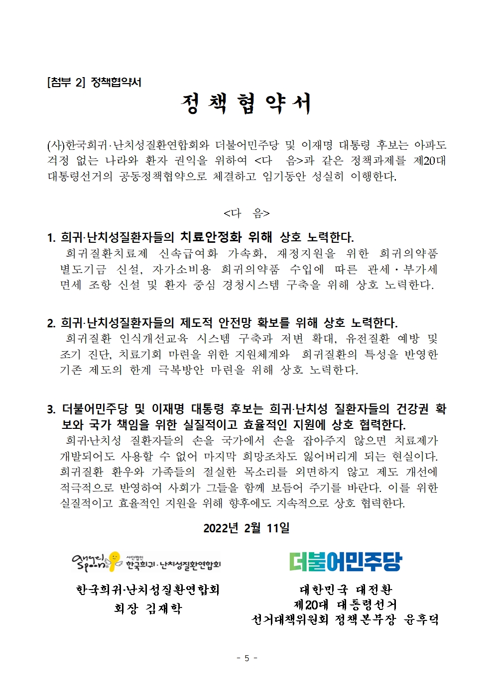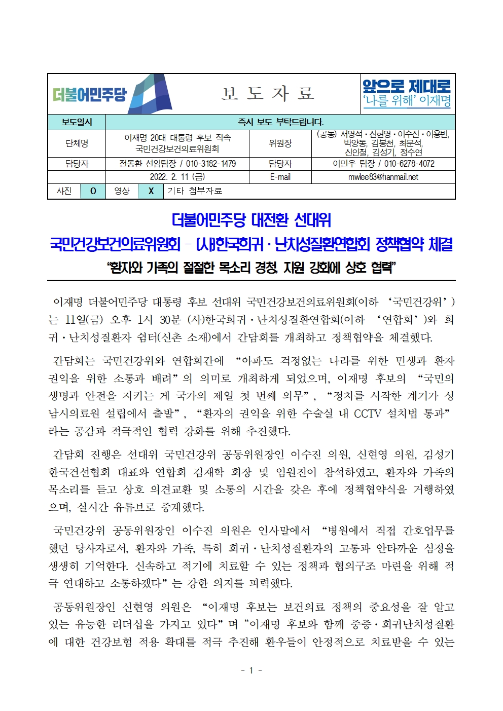[보도자료] 더불어민주당 선대위 국민건강보건의료위원회, (사)한국희귀·난치성질환연합회 간담회 및 정책협약 체결