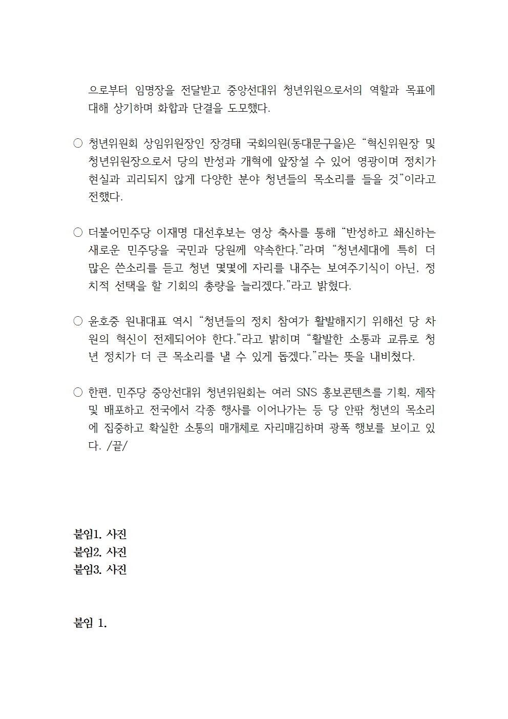[보도자료] 더불어민주당 선대위 청년위원회, 혁신콘서트 및 임명장 수여식 개최