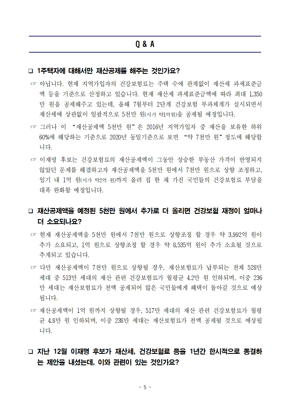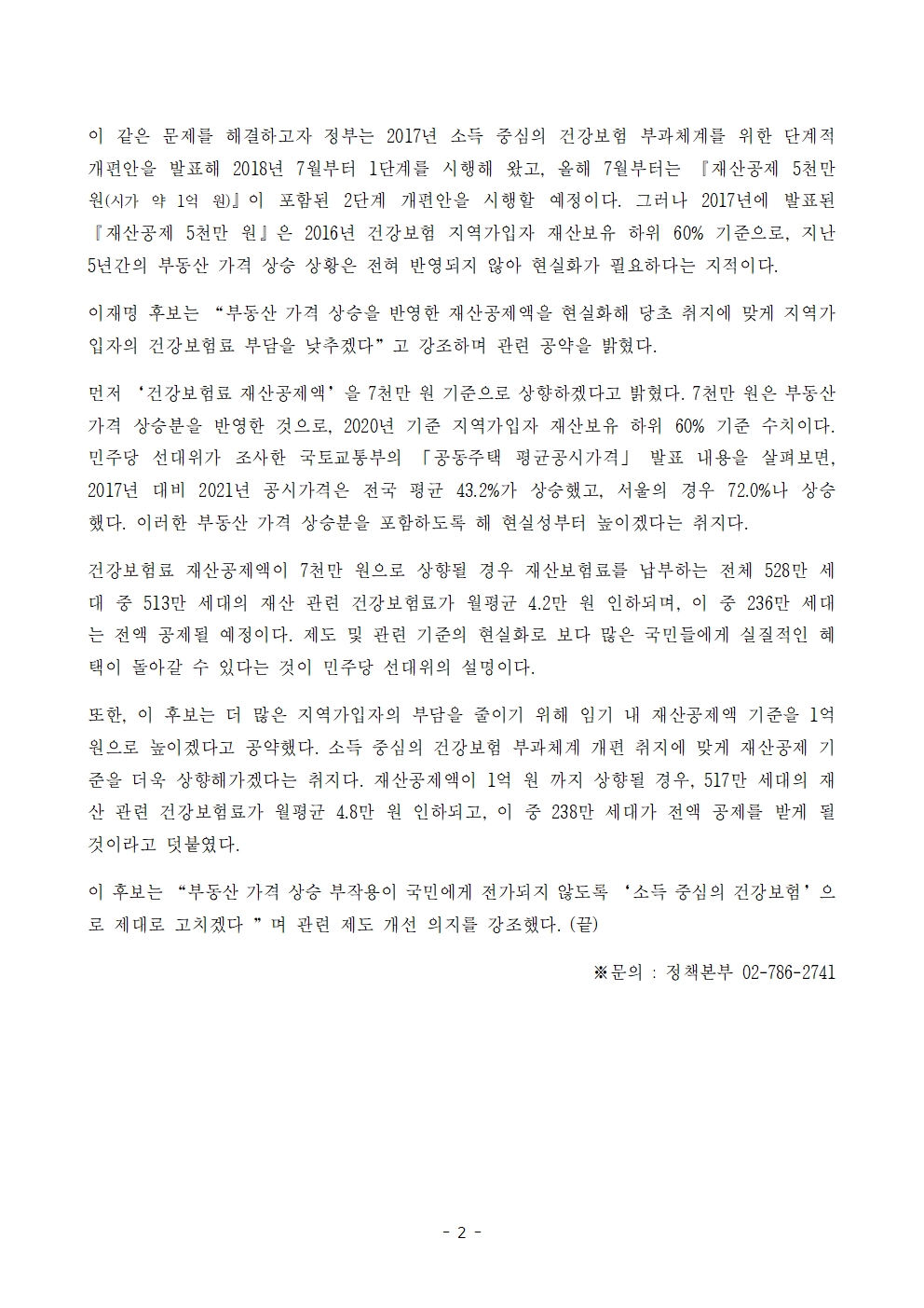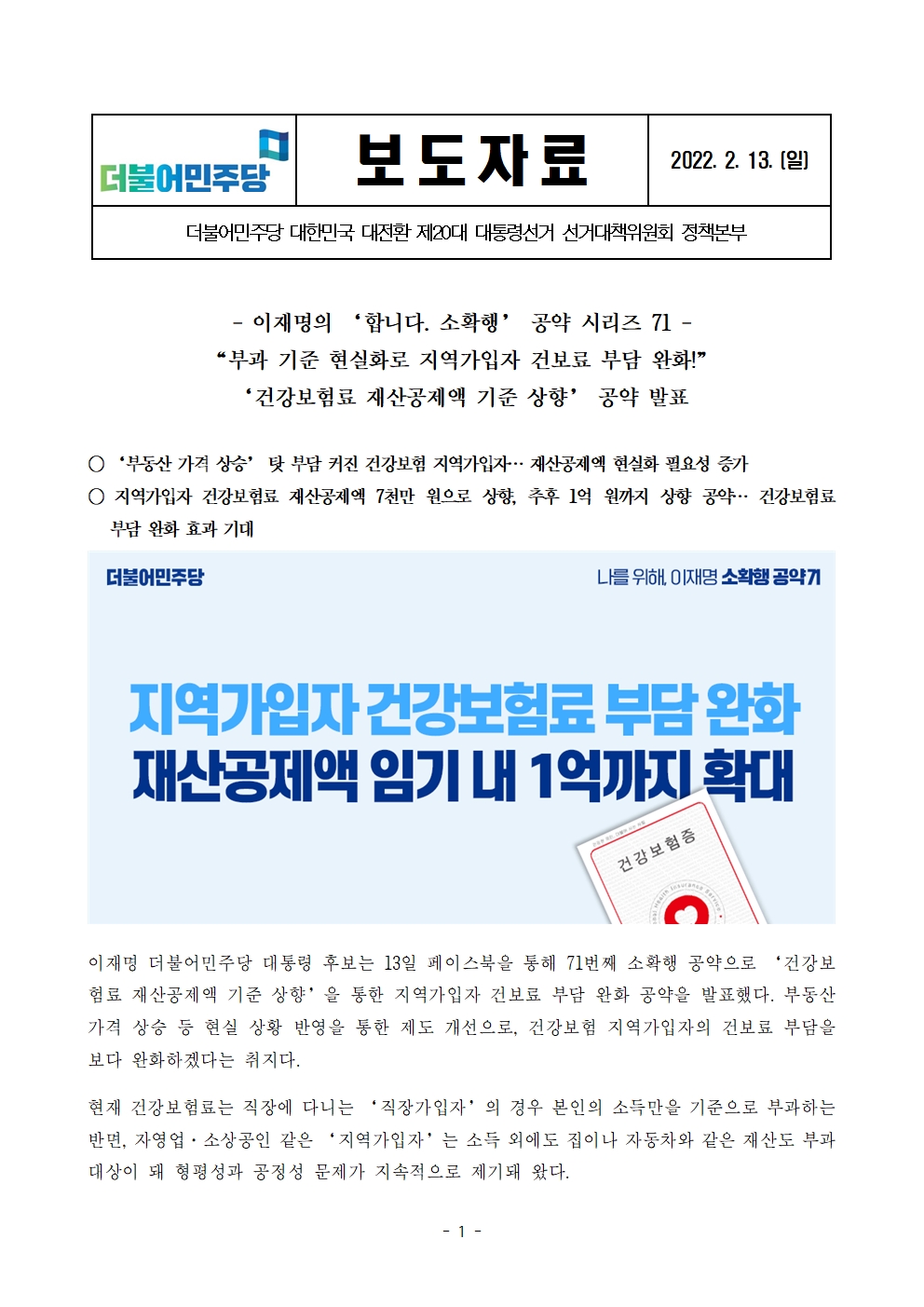 [보도자료] 더불어민주당 선대위 정책본부, '이재명은 합니다. 소확행 공약 시리즈 71' 건강보험료 재산공제액 기준 상향 공약 발표