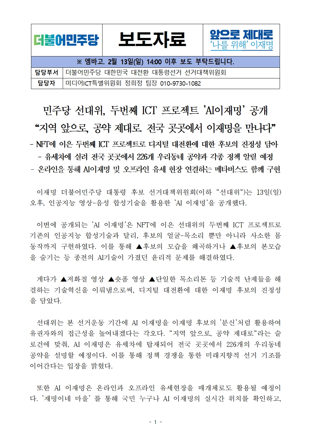 [보도자료] 더불어민주당 선대위, 두번째 ICT 프로젝트 'AI 이재명' 공개