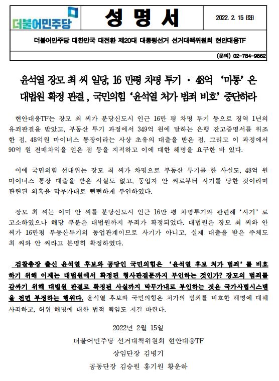 [성명서] (더불어민주당 선대위 현안대응TF) 윤석열 장모 최 씨 일당, 16 만평 차명 투기 · 48억 ‘마통’은 대법원 확정 판결 , ‘윤석열 처가 범죄 비호'중단하라