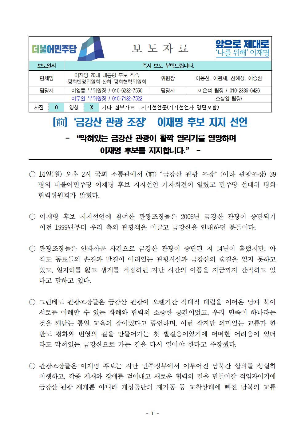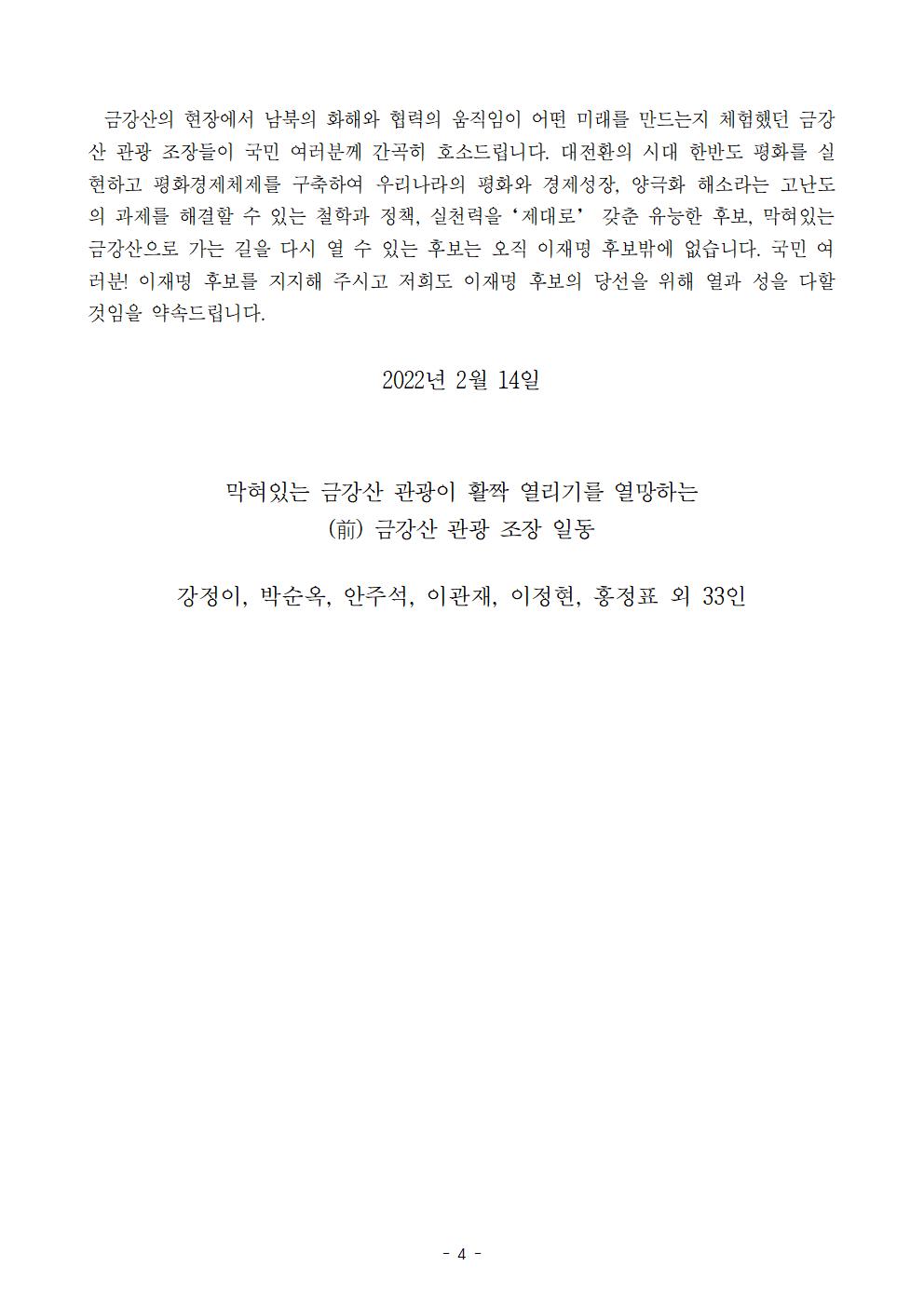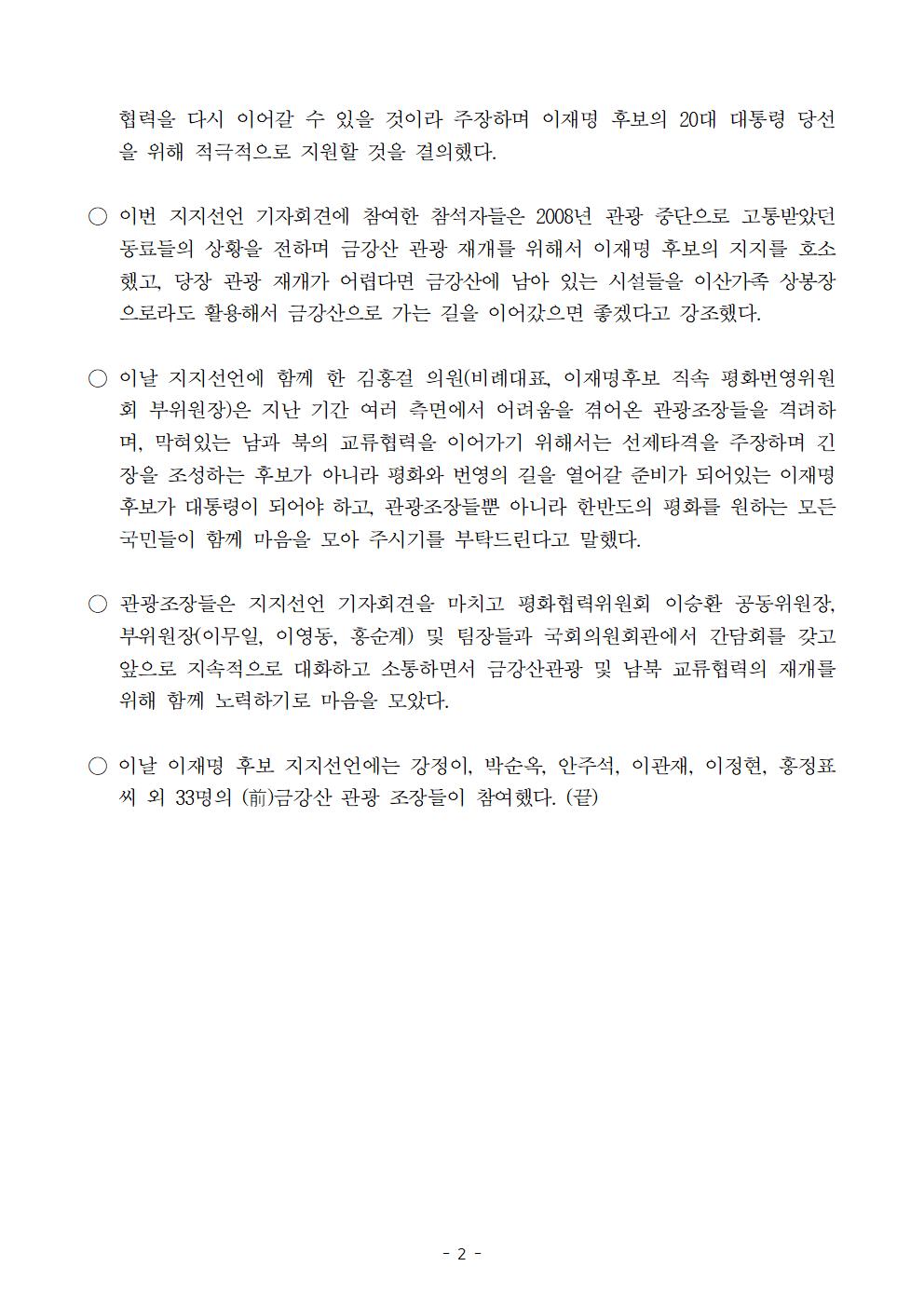 [보도자료] 더불어민주당 선대위 평화협력위원회 금강사 관광 조장 이재명 후보 지지 선언