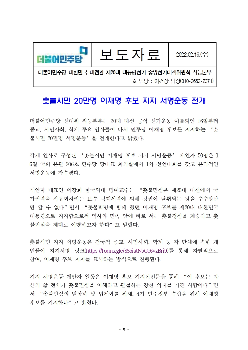 [보도자료] 더불어민주당 선대위 직능본부, 들불 시민의병단 출범 및 촛불시민 20만 명 서명운동 전개