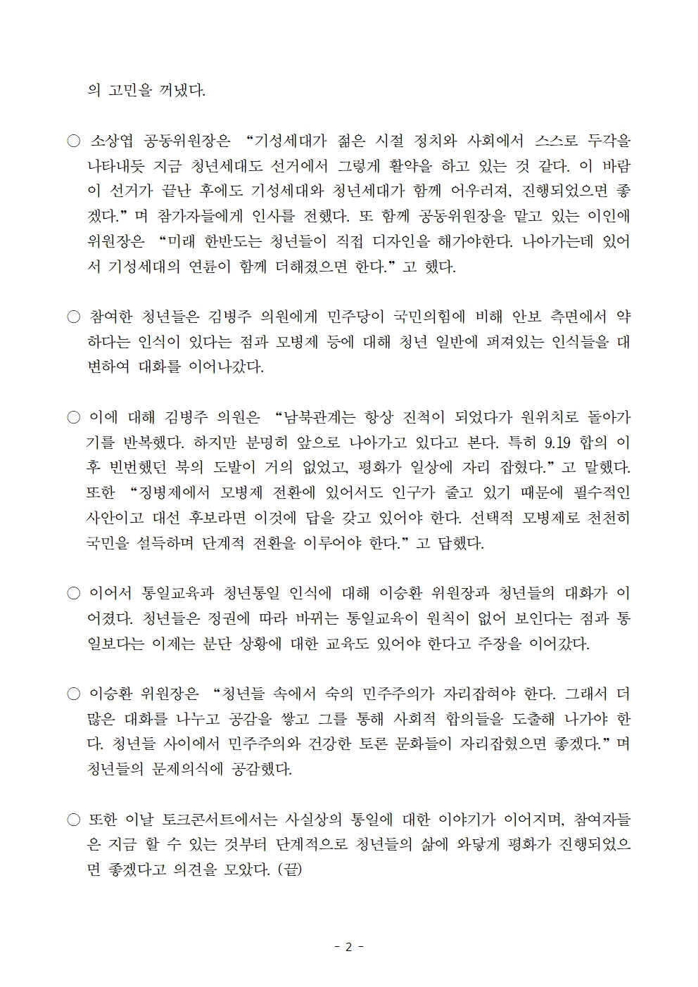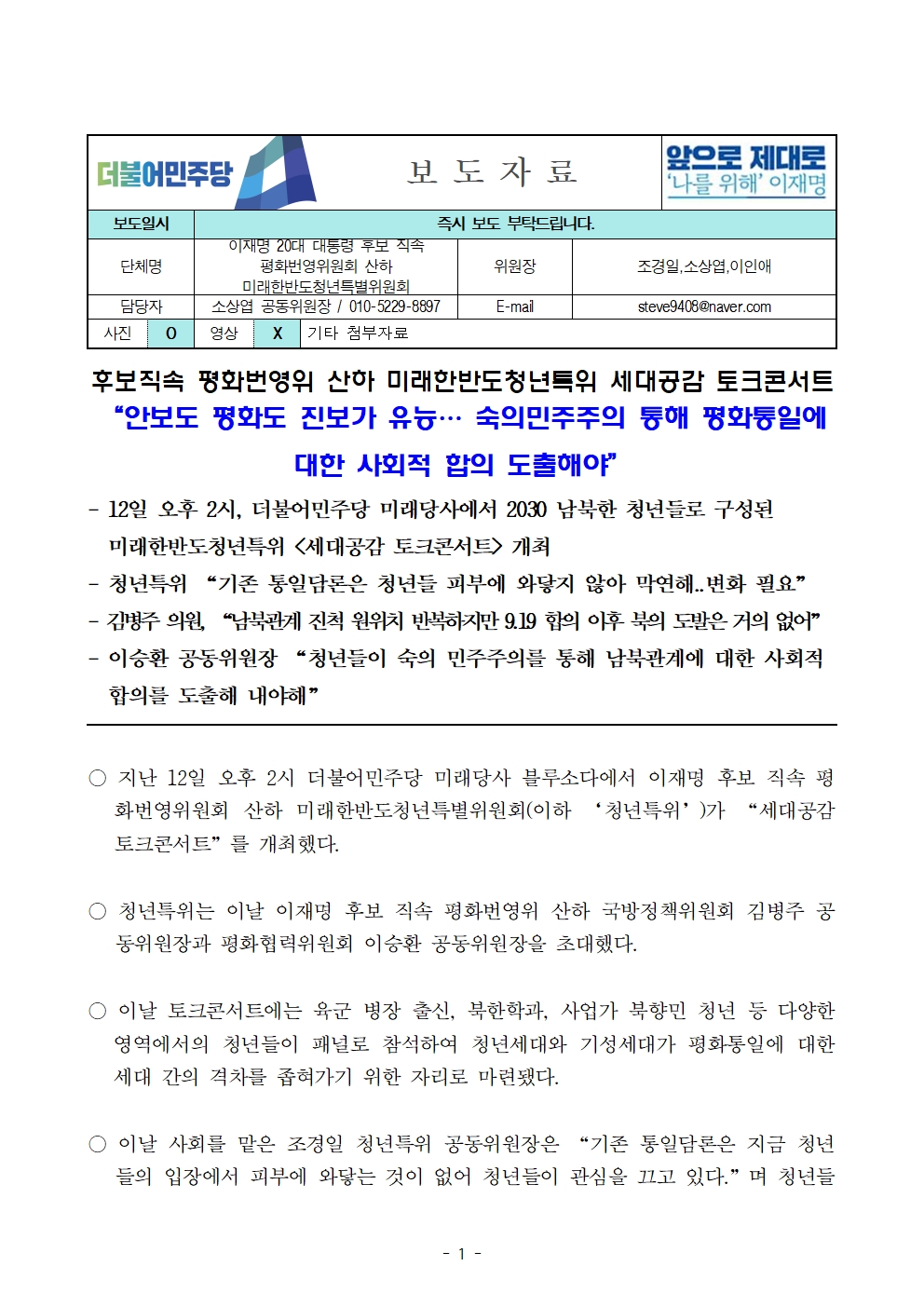 [보도자료] 더불어민주당 선대위 평화번영위원회, 미래한반도청년특위 세대공감 토크콘서트 개최