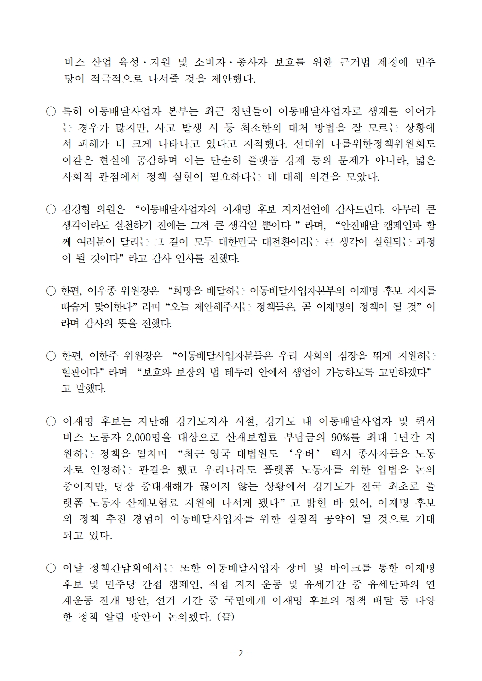 [보도자료] 더불어민주당 선대위 나를위한정책위원회, 이동배달 사업자 700명 후보 지지선언