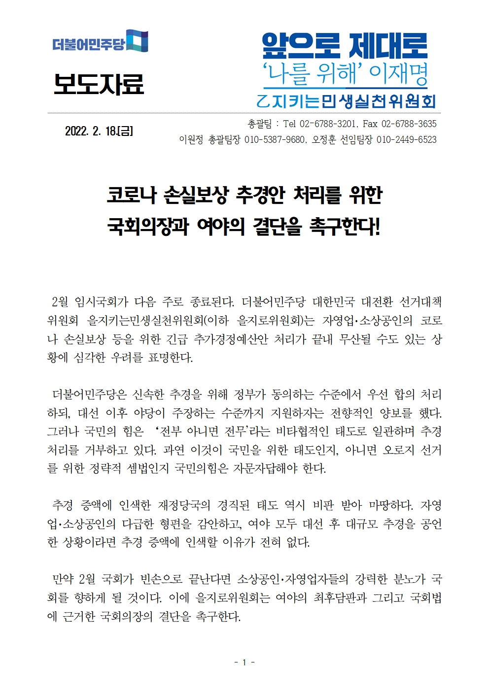 [보도자료] 더불어민주당 선대위 을지로위원회, 코로나 손실보상 추경안 처리를 위한 국회의장과 여야의 결단을 촉구한다!