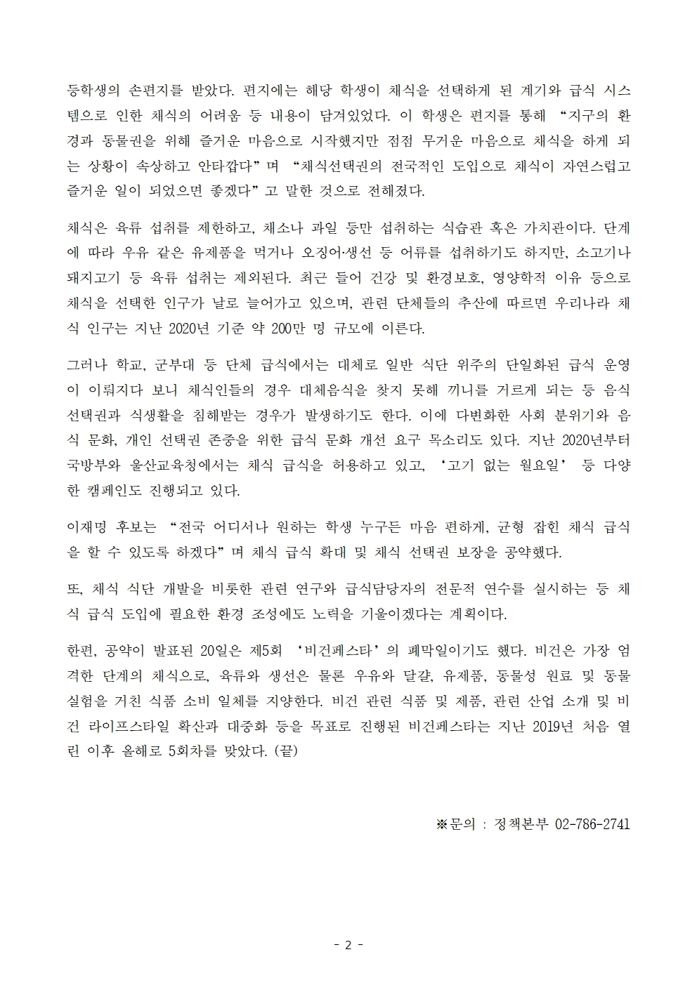[보도자료] 더불어민주당 선대위 정책본부, '이재명은 합니다. 소확행 공약 시리즈 75' 채식 급식 선택권 확대 공약 발표