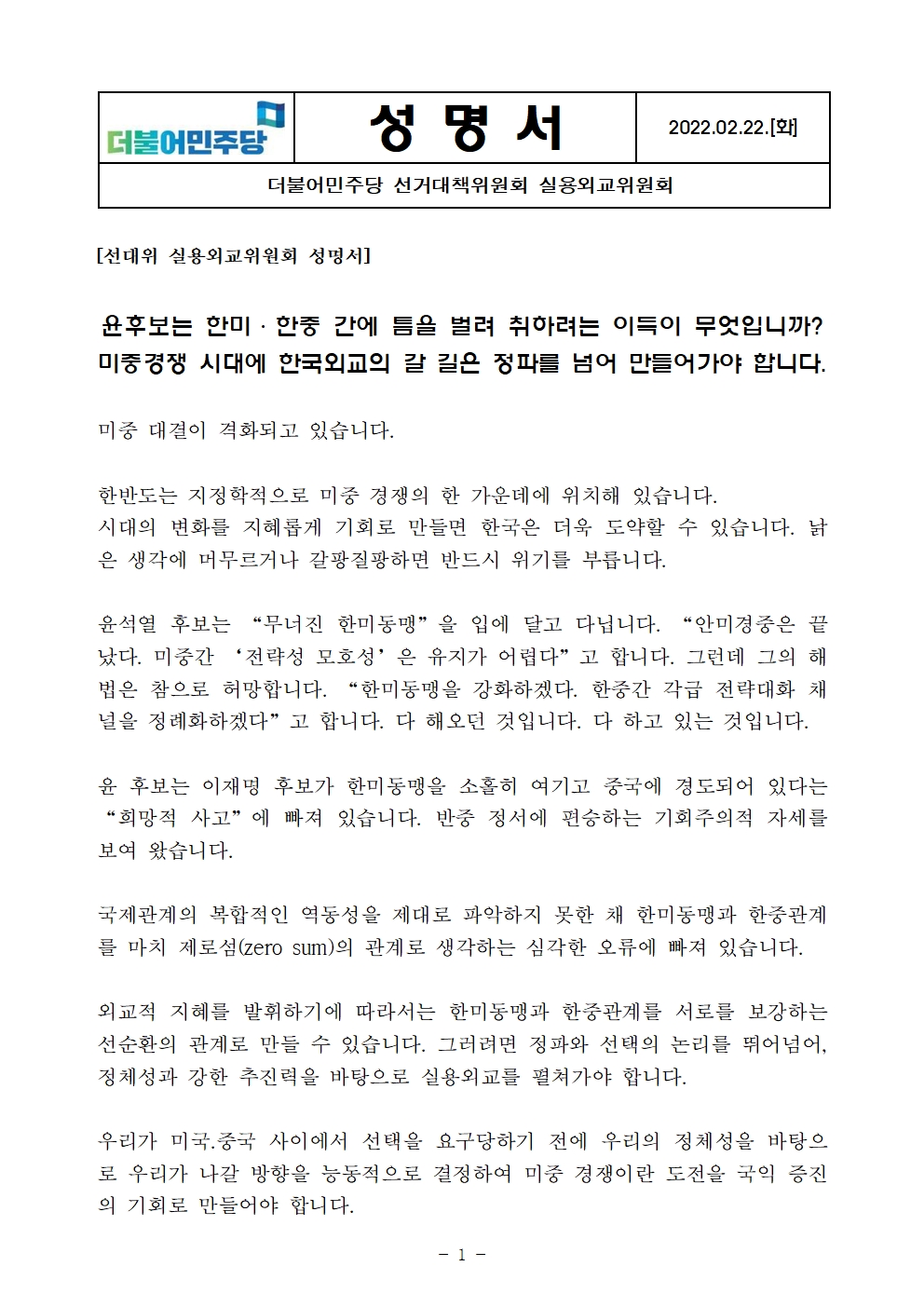 [성명서] 더불어민주당 선대위 실용외교위원회, 윤후보는 한미·한중 간에 틈을 벌려 취하려는 이득이 무엇입니까? 미중경쟁 시대에 한국외교의 갈 길은 정파를 넘어 만들어가야 합니다.