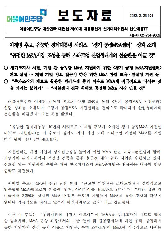 [보도자료] 더불어민주당 선대위 현안대응TF, 이재명 후보 '유능한 경제대통령' 열 번째 시리즈, '경기 공정M&A센터' 성과 소개