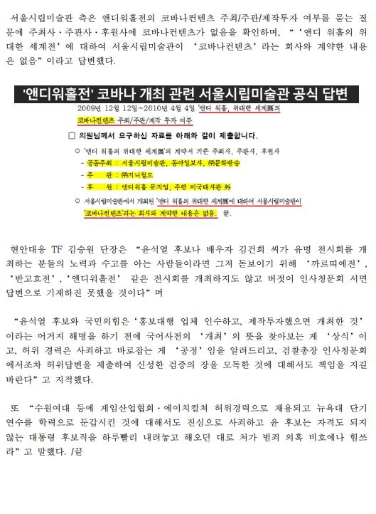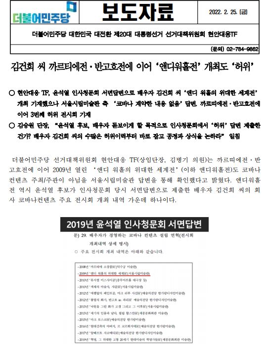 [보도자료] (더불어민주당 선대위 현안대응TF) 김건희 씨, 까르티에전, 반고흐전에 이어 '앤디워홀전' 개최도 '허위'