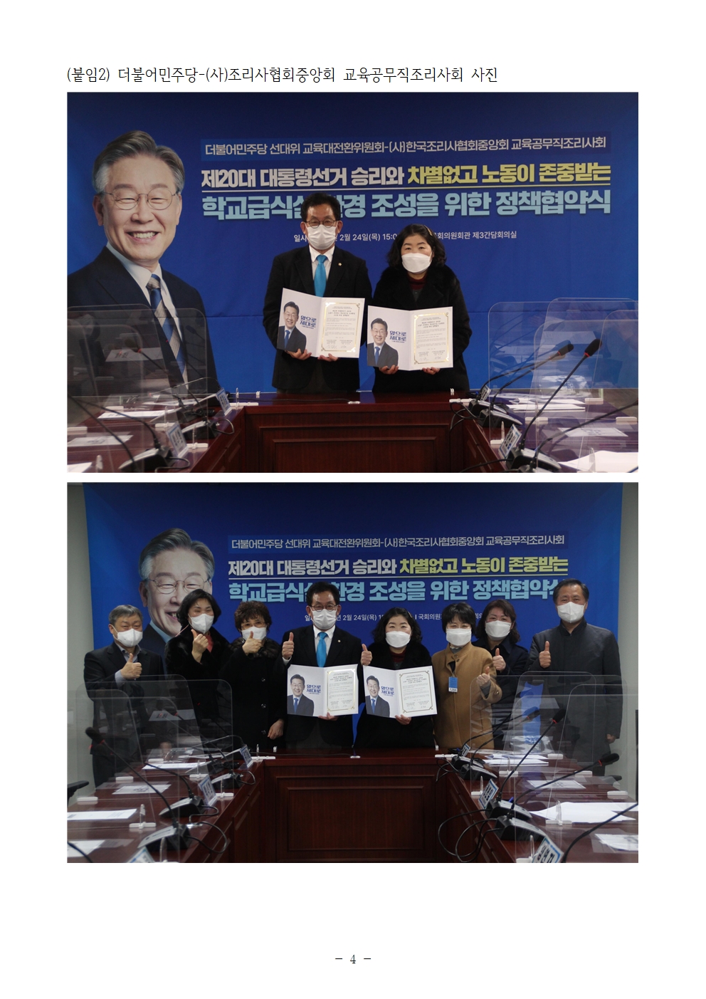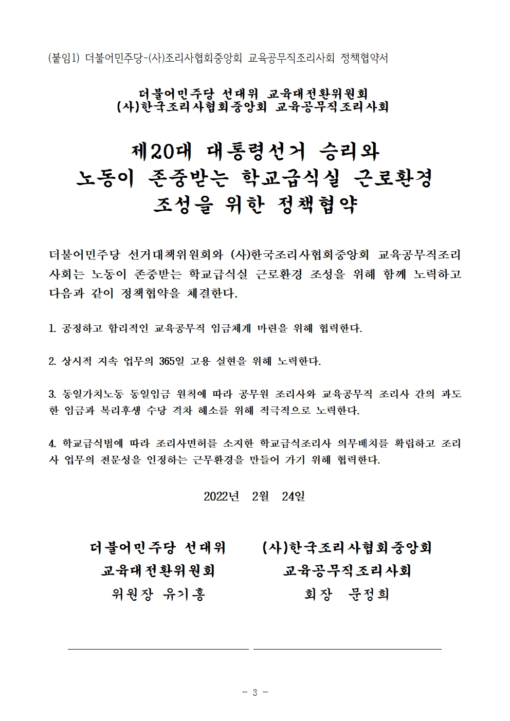 [보도자료] 더불어민주당 선대위 교육대전환위원회, (사)조리사협회중앙회 교육공무직조리사회와 정책협약식 개최