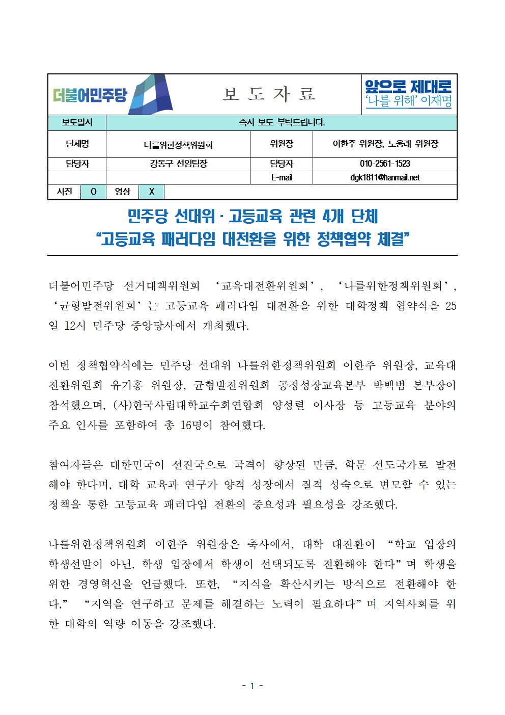 [보도자료] 더불어민주당 선대위 나를위한정책위원회, 고등교육 관련 4개 단체 정책협약 체결