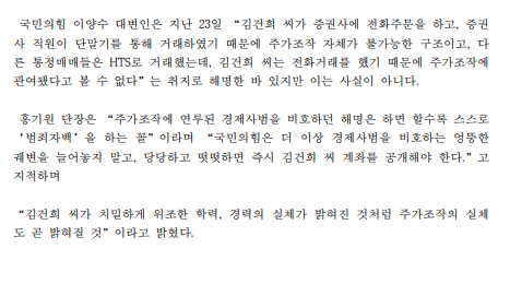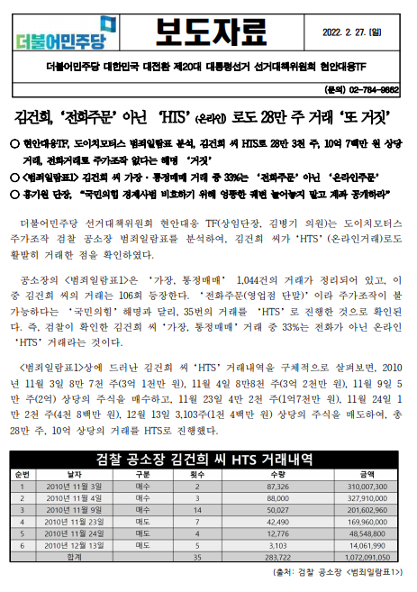 [보도자료] (더불어민주당 선대위 현안대응TF) 김건희, ‘전화주문’ 아닌 ‘HTS’(온라인) 로도 28만 주 거래 ‘또 거짓’