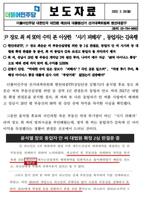 [보도자료] (더불어민주당 선대위 현안대응TF) 尹 장모 최 씨, 90억 수익 본 이상한 ‘사기 피해자’, 동업자는 감옥행