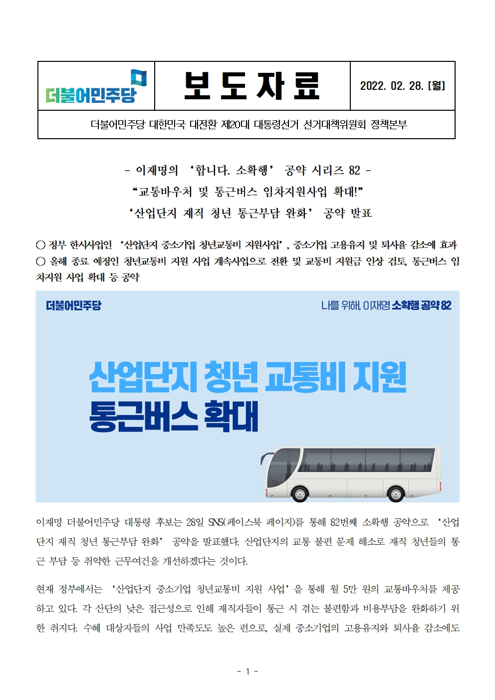 [보도자료] 더불어민주당 선대위 정책본부, '이재명은 합니다. 소확행 공약 시리즈 82' 산업단지 재직 청년 통근부담 완화 공약 발표