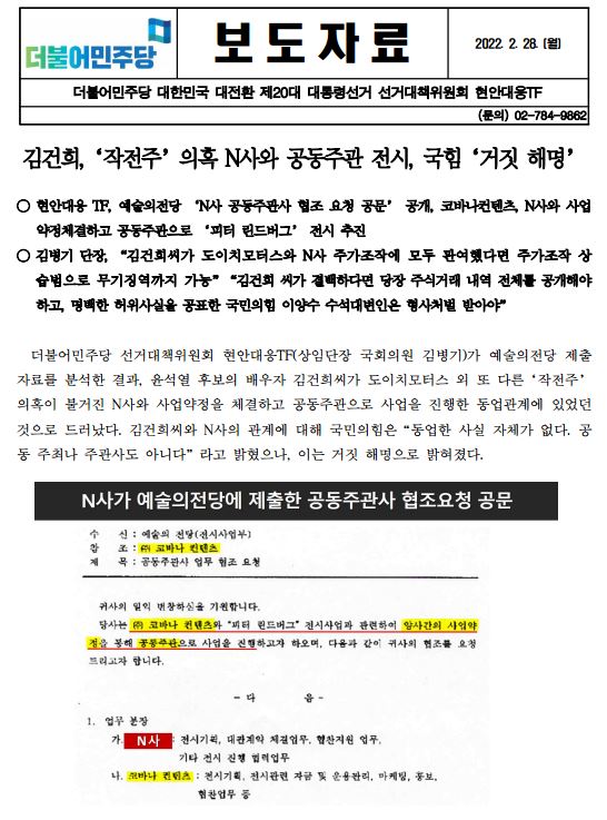 [보도자료] (더불어민주당 선대위 현안대응TF) 김건희, '작전주' 의혹 N사와 공동주관 전시, 국힘 '거짓 해명'