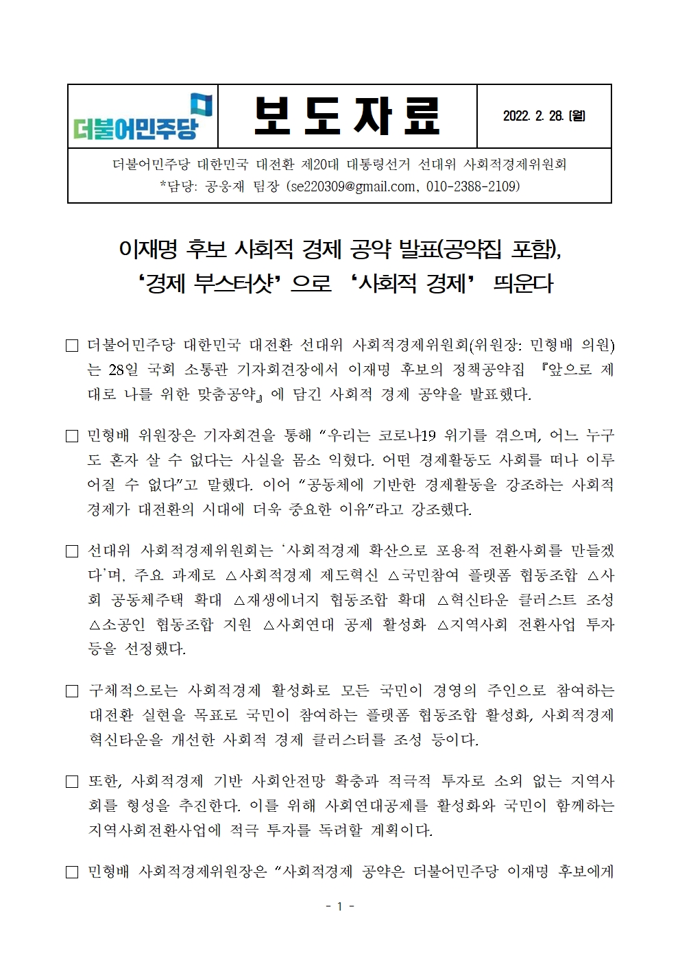[보도자료] 더불어민주당 선대위 사회적경제위원회, 사회적 경제 공약 발표