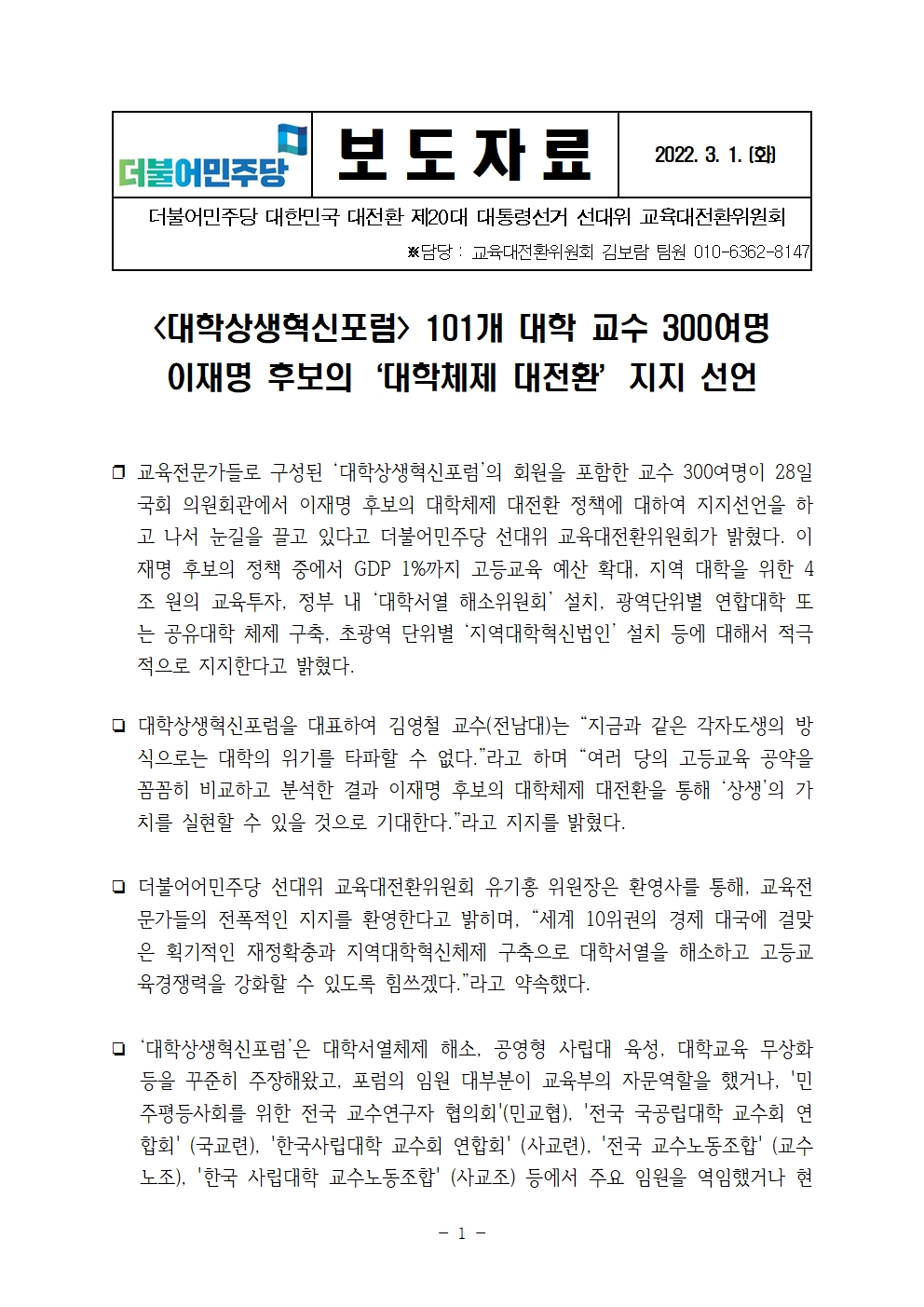 [보도자료] 더불어민주당 선대위 교육대전환위원회, '대학상생혁신포럼' 101개 대학 교수 300명, 후보 대학체제 대전환 지지선언