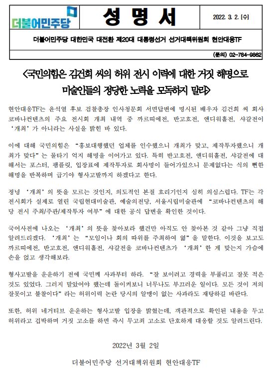[성명서] (더불어민주당 선대위 현안대응TF) 국민의힘은 김건희 씨의 허위 전시 이력에 대한 거짓 해명으로 미술인들의 정당한 노력을 모독하지 말라
