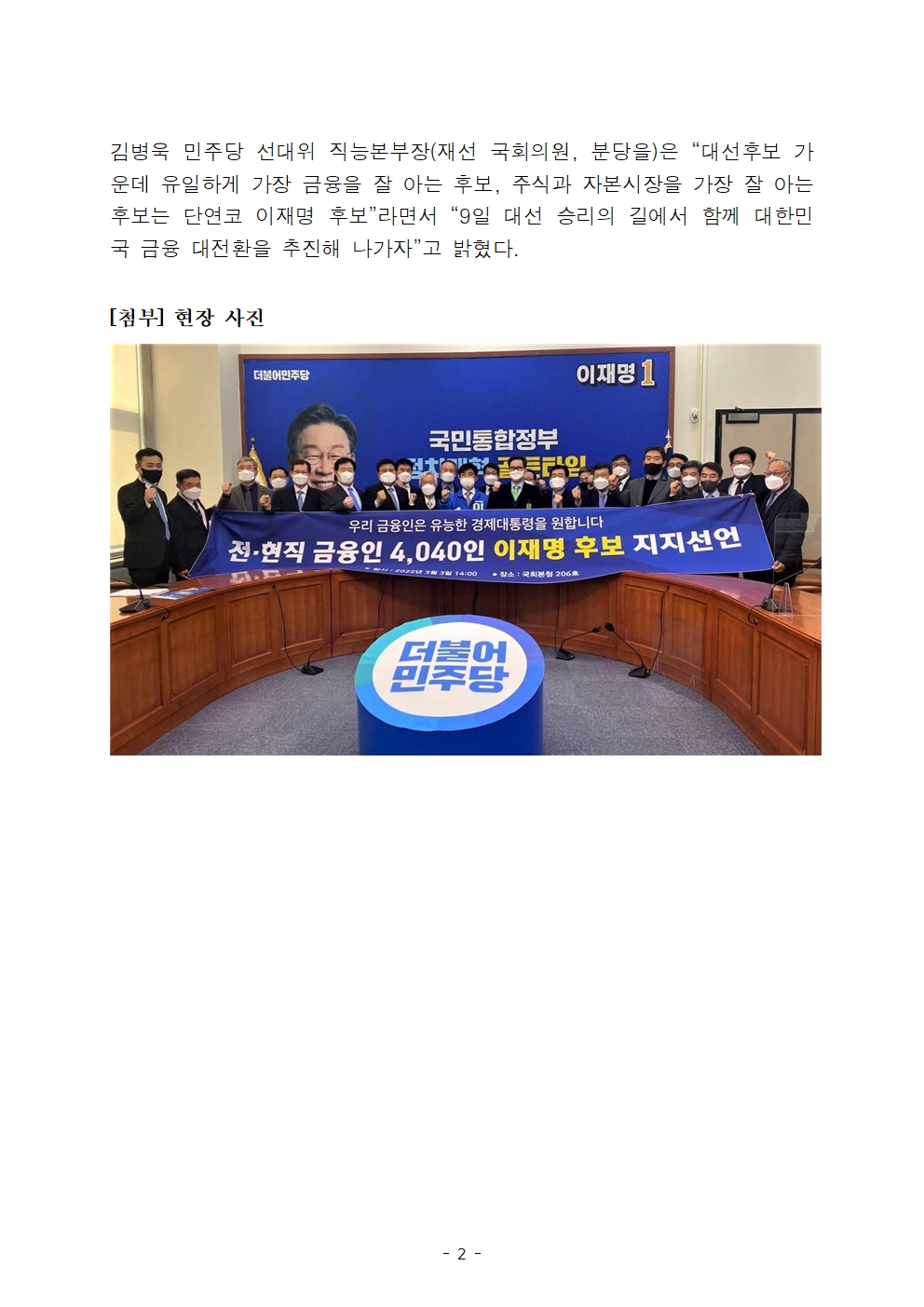 [보도자료] 더불어민주당 선대위 직능본부, 전·현직 금융인 4,040명 및 촛불시민 5,015명 후보 지지선언