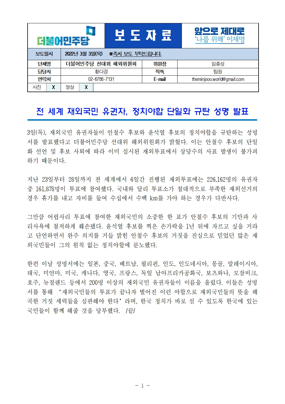 [보도자료] 더불어민주당 선대위 해외위원회, 재외국민 유권자, 정치야합 단일화 규탄 성명 발표