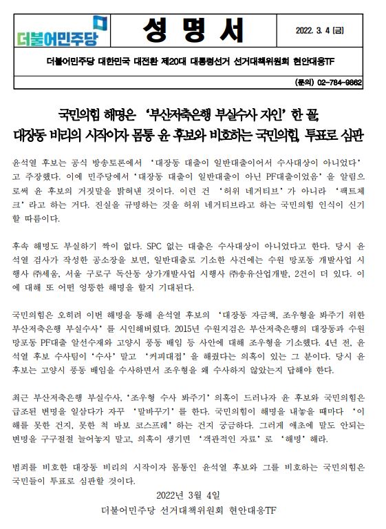[성명서] (더불어민주당 선대위 현안대응TF) 국민의힘 해명은 ‘부산저축은행 부실수사 자인’한 꼴, 대장동 비리의 시작이자 몸통 윤 후보와 비호하는 국민의힘, 투표로 심판