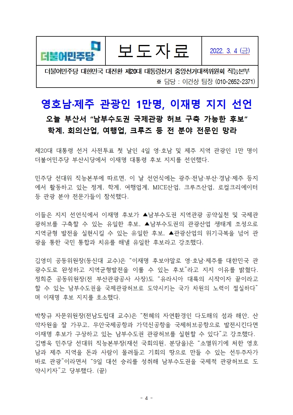 [보도자료] 더불어민주당 선대위 직능본부, 시민사회 20만 명 및남부권 관광인 1만 명 후보 지지선언