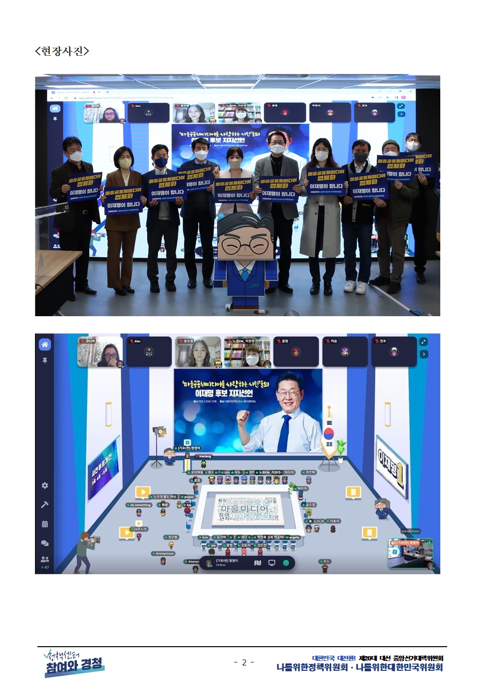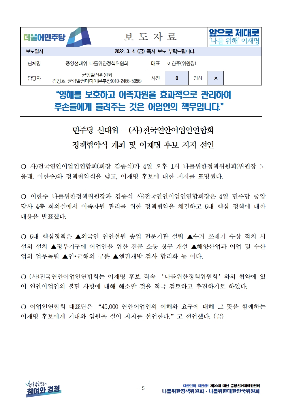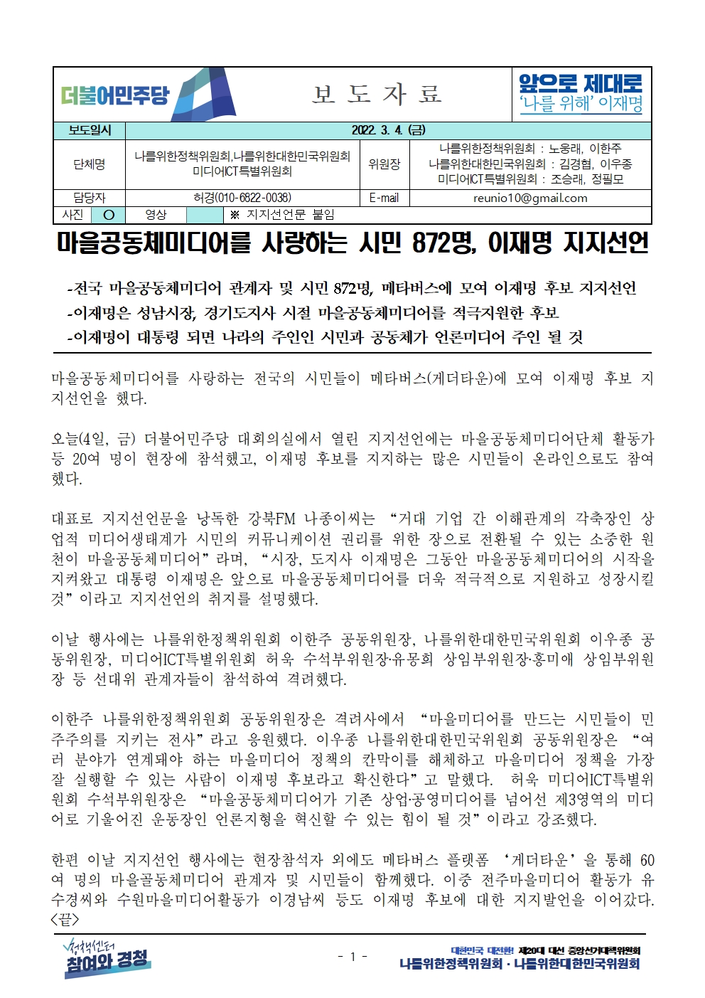 [보도자료] 더불어민주당 선대위 나를위한정책위원회·나를위한대한민국위원회·미디어ICT특별위원회, 마을공동체미디어 관계자·시민 872명 후보 지지선언 및 전국연안어업인연합회 정책협약식