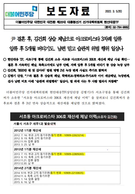 [보도자료] (더불어민주당 선대위 현안대응TF) 尹 결혼 후, 김건희 상습 체납으로 아크로비스타 3차례 압류. 압류 후 5개월 버티기도.. 남편 믿고 습관적 위법 행위 일삼나
