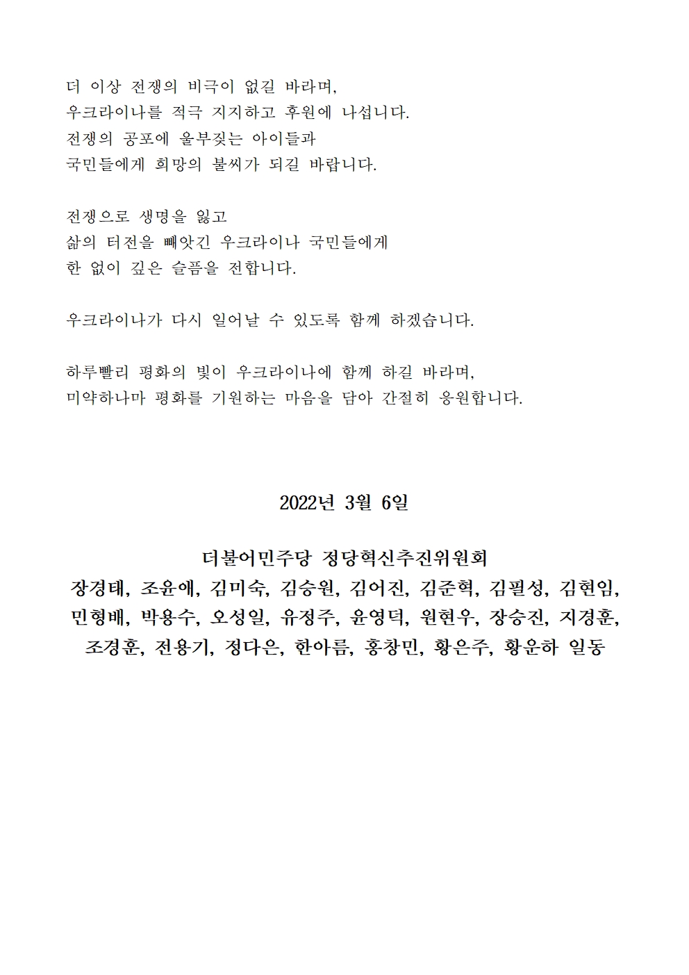 [보도자료] 더불어민주당 정당혁신추진위원회, 우크라이나 침공 규탄 및 지지, 후원 동참 입장문 발표