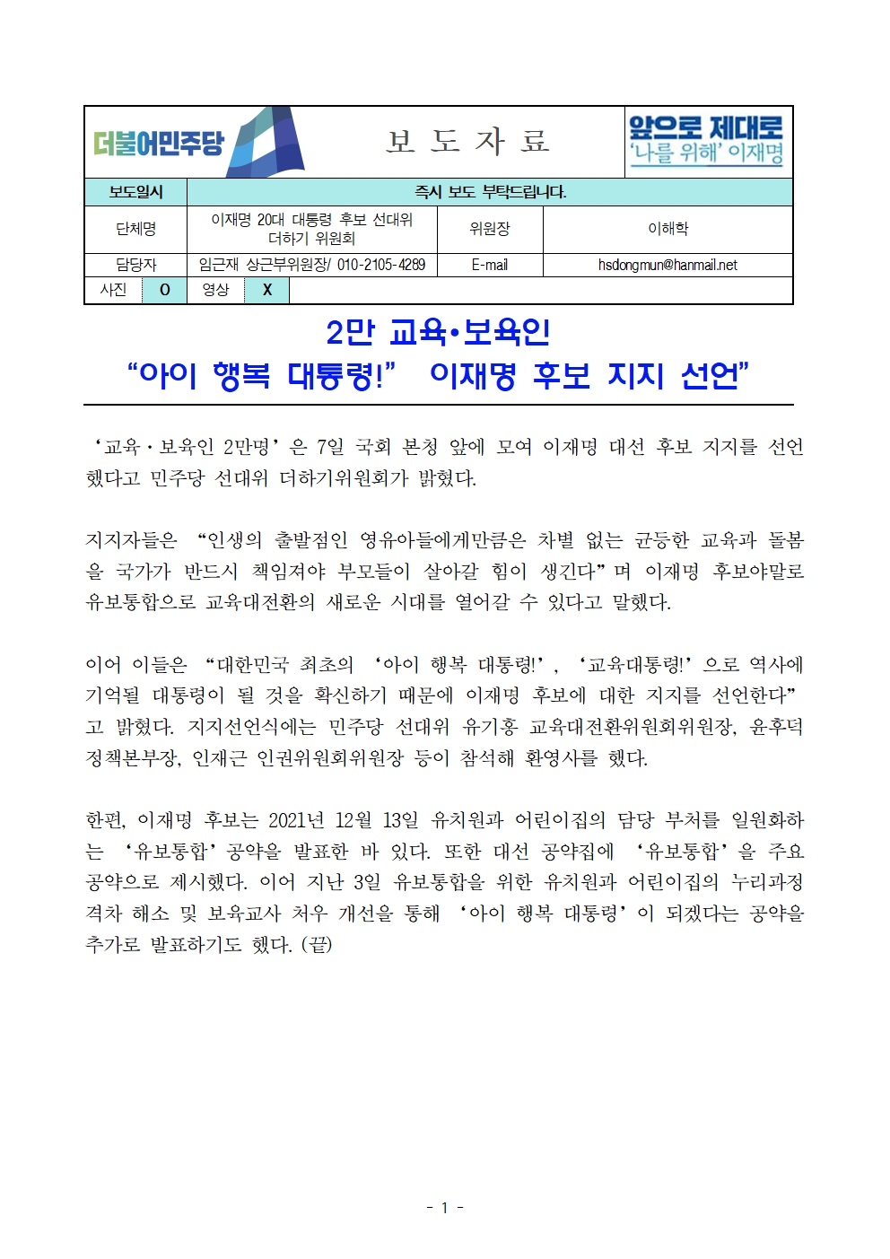 [보도자료] 더불어민주당 선대위 더하기위원회, 2만 교육∙보육인 후보 지지선언