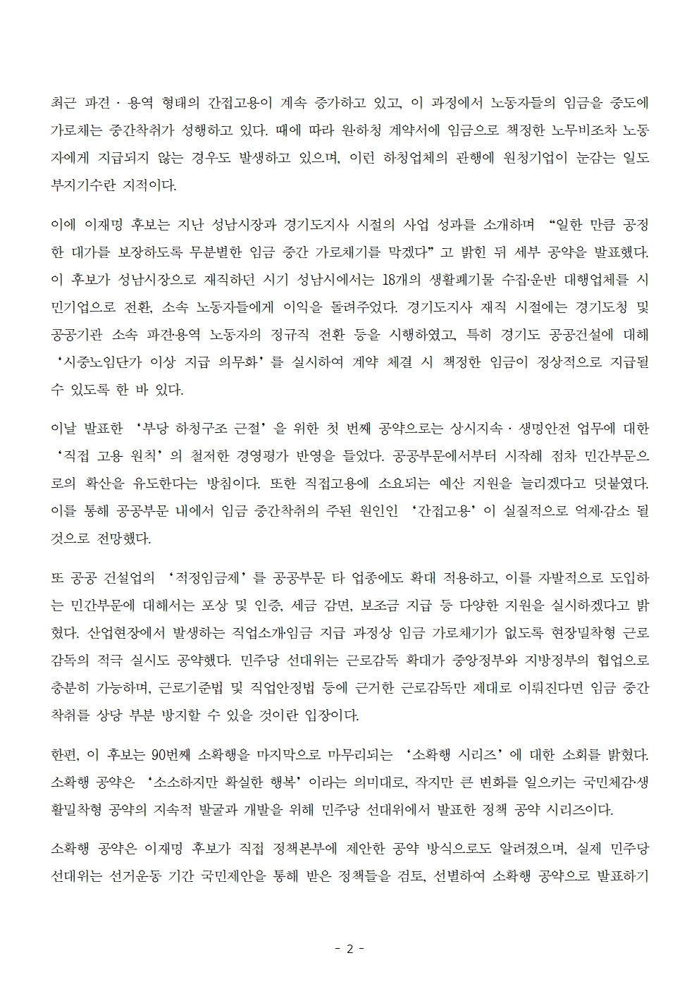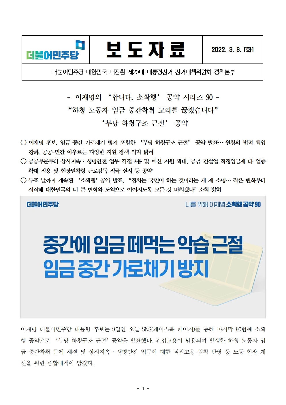 [보도자료] 더불어민주당 선대위 정책본부, '이재명은 합니다. 소확행 공약 시리즈 90' 부당 하청구조 근절 공약 발표