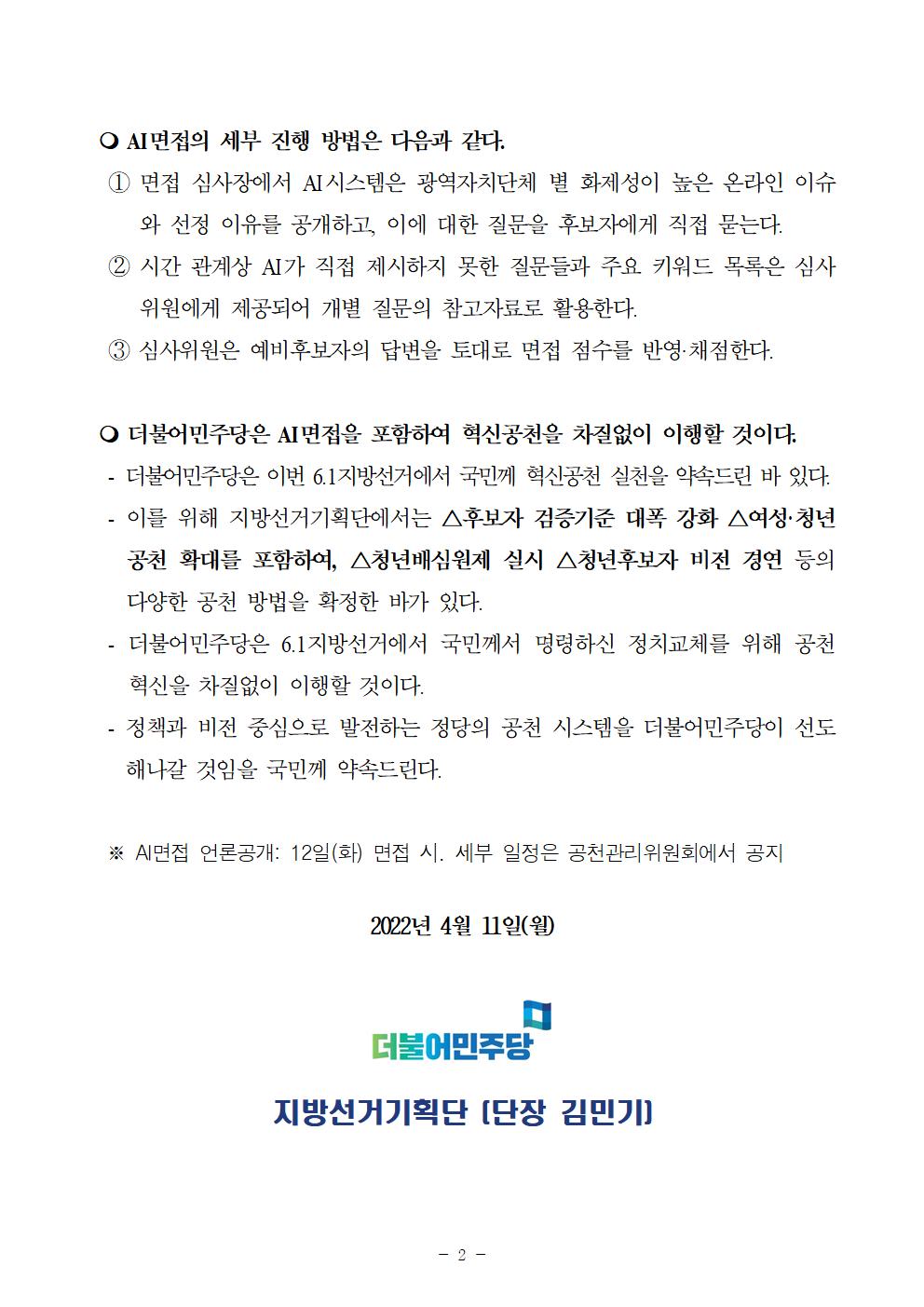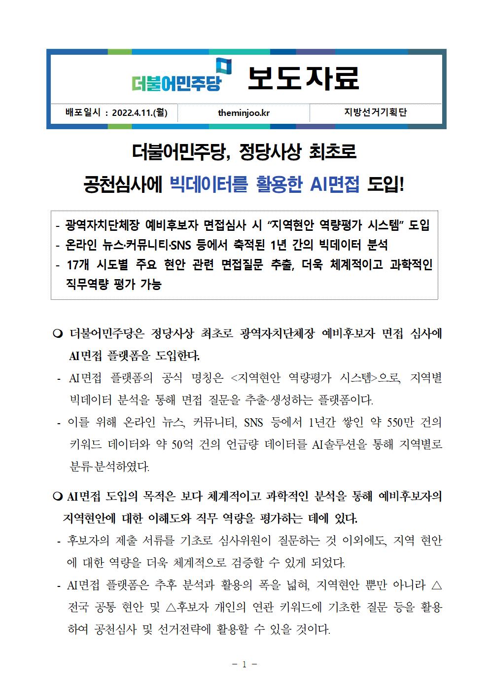[보도자료] 더불어민주당 지방선거기획단, 정당사상 최초로 공천심사에 빅데이터를 활용한 AI면접 도입