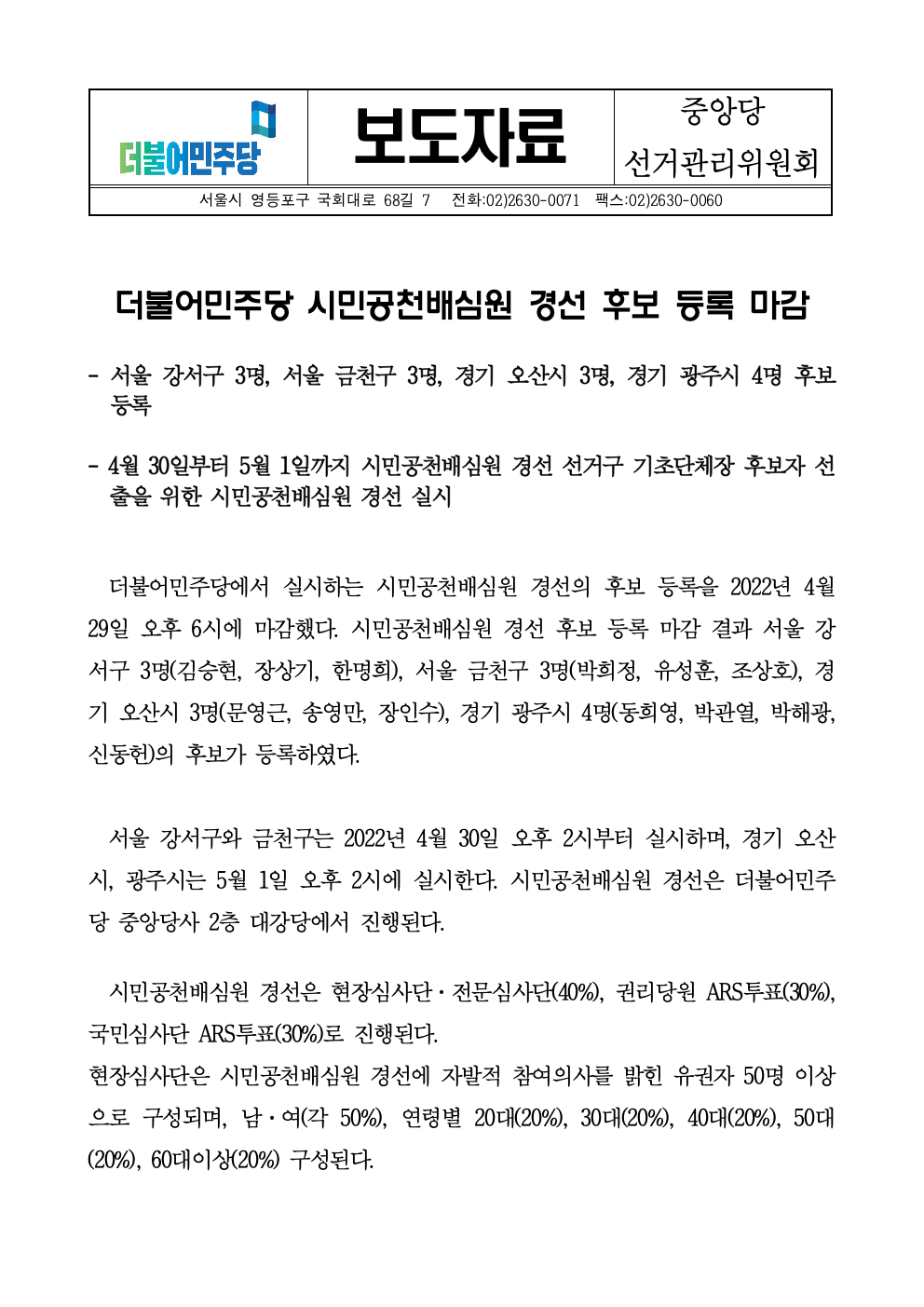 [보도자료]더불어민주당 시민공천배심원 경선 후보 등록 마감