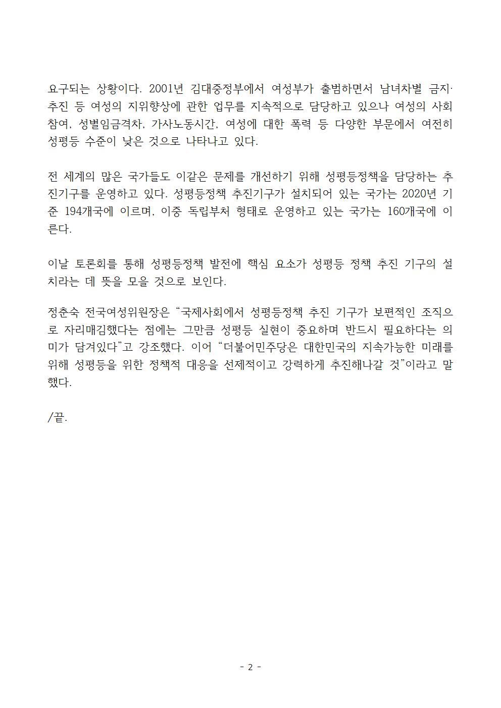 [보도자료] 더불어민주당 전국여성위원회, 성평등 추진기구 강화를 위한 국제토론회 개최